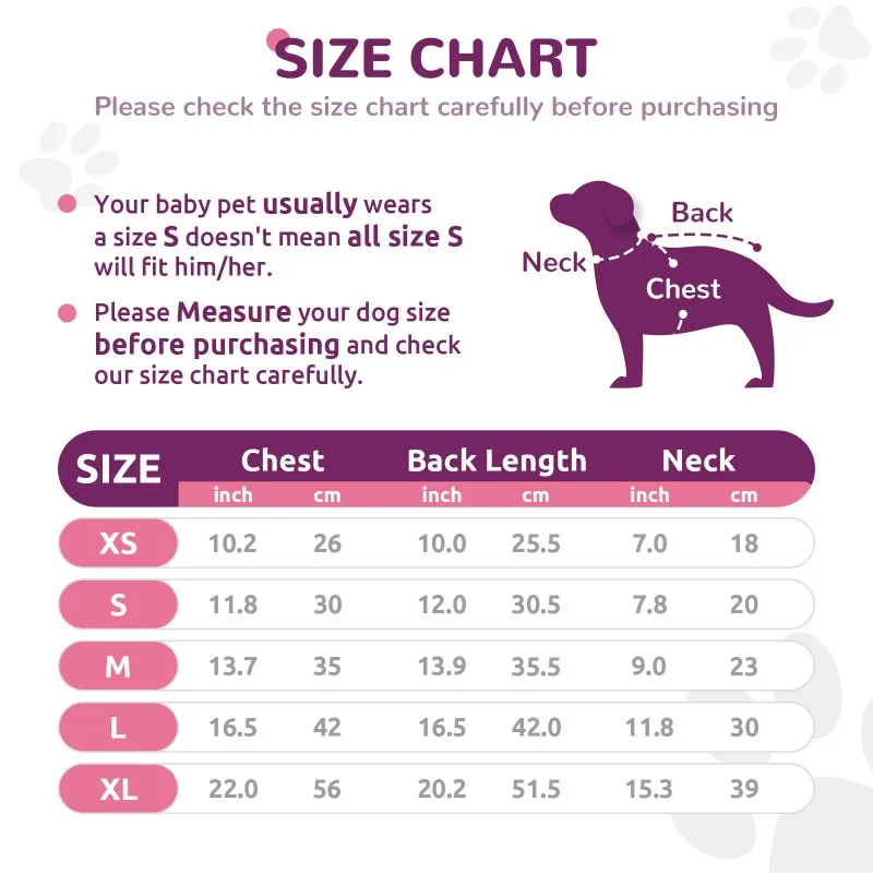 XS: Longitud de la espalda 25,5 cm/10''; Pecho 26 cm/10,2''; Cuello 18 cm/7,0''