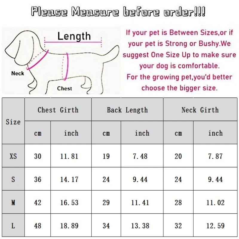 XS: pecho 30cm/11,81 ''; longitud 19cm/7,48''; Cuello 20cm/7,87''