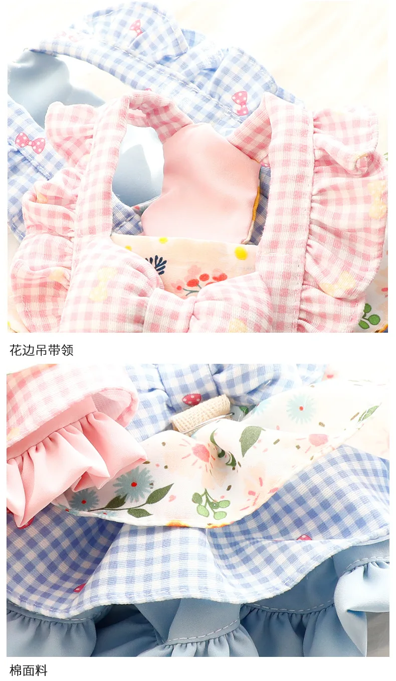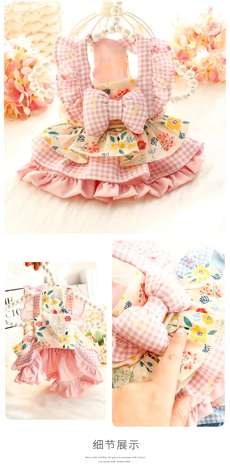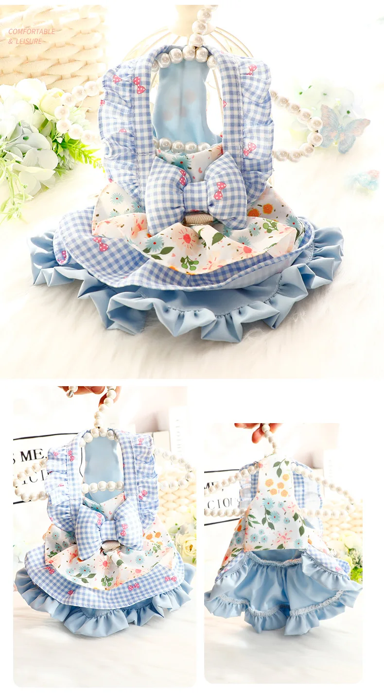 Ropa de primavera/verano para perros, vestido de princesa Floral transpirable para perros y gatos con lazo, vestido a cuadros estilo Lolita para perros pequeños