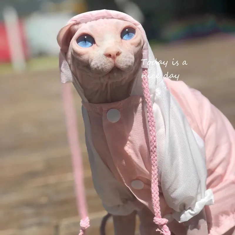 Diseño: Abrigo con capucha y protección solar de gato Sphnx con mangas largas.