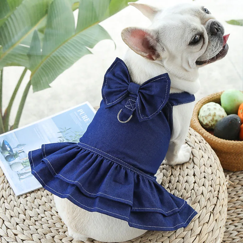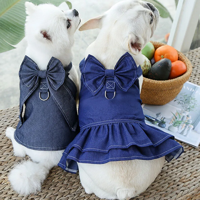 Ropa de mezclilla para perro Primavera Verano perro vestido arnés Bulldog francés Jeans gato BowTie sudaderas con capucha pequeños perros grandes York D-Ring falda
