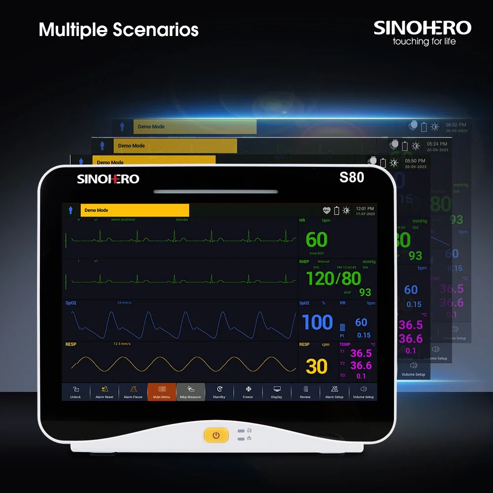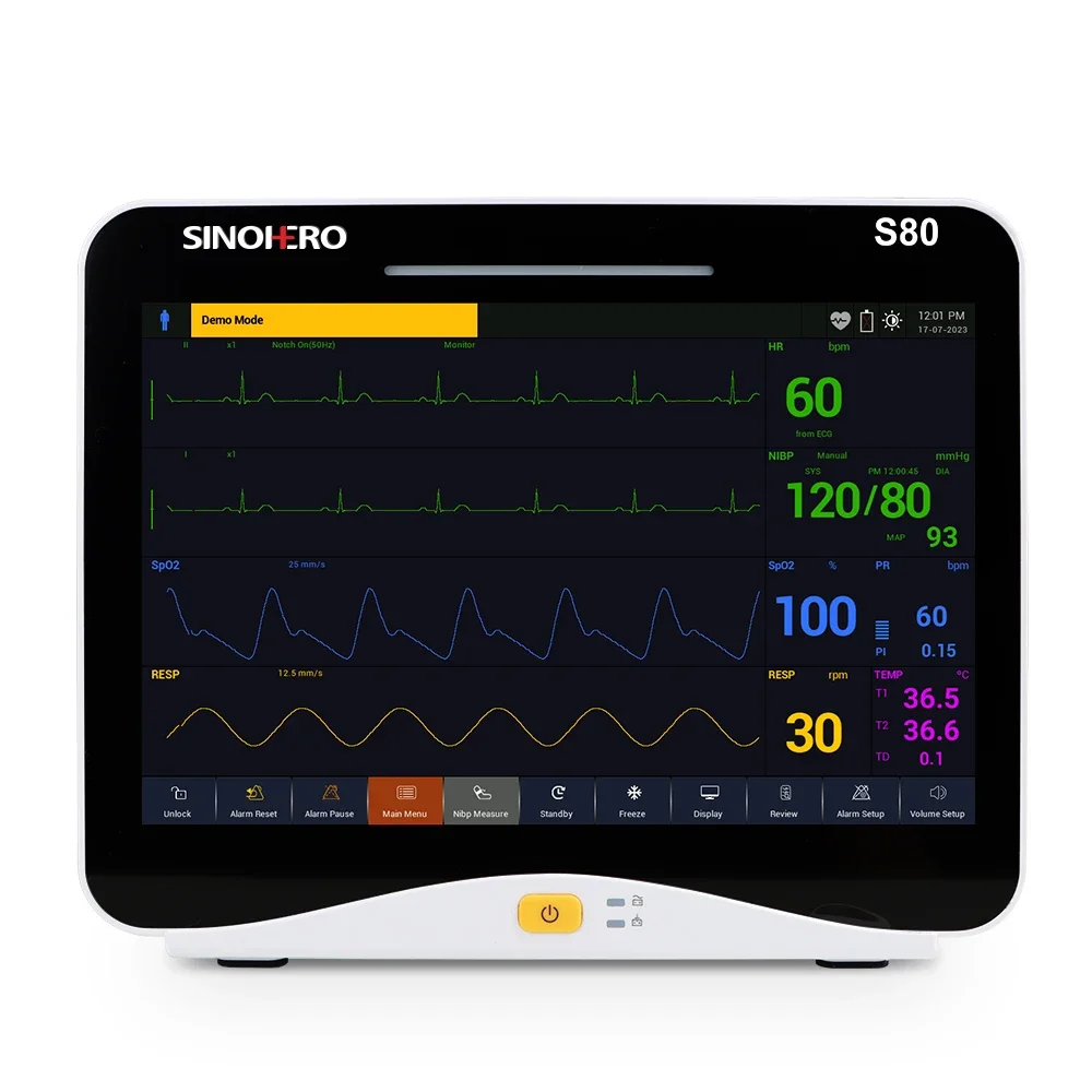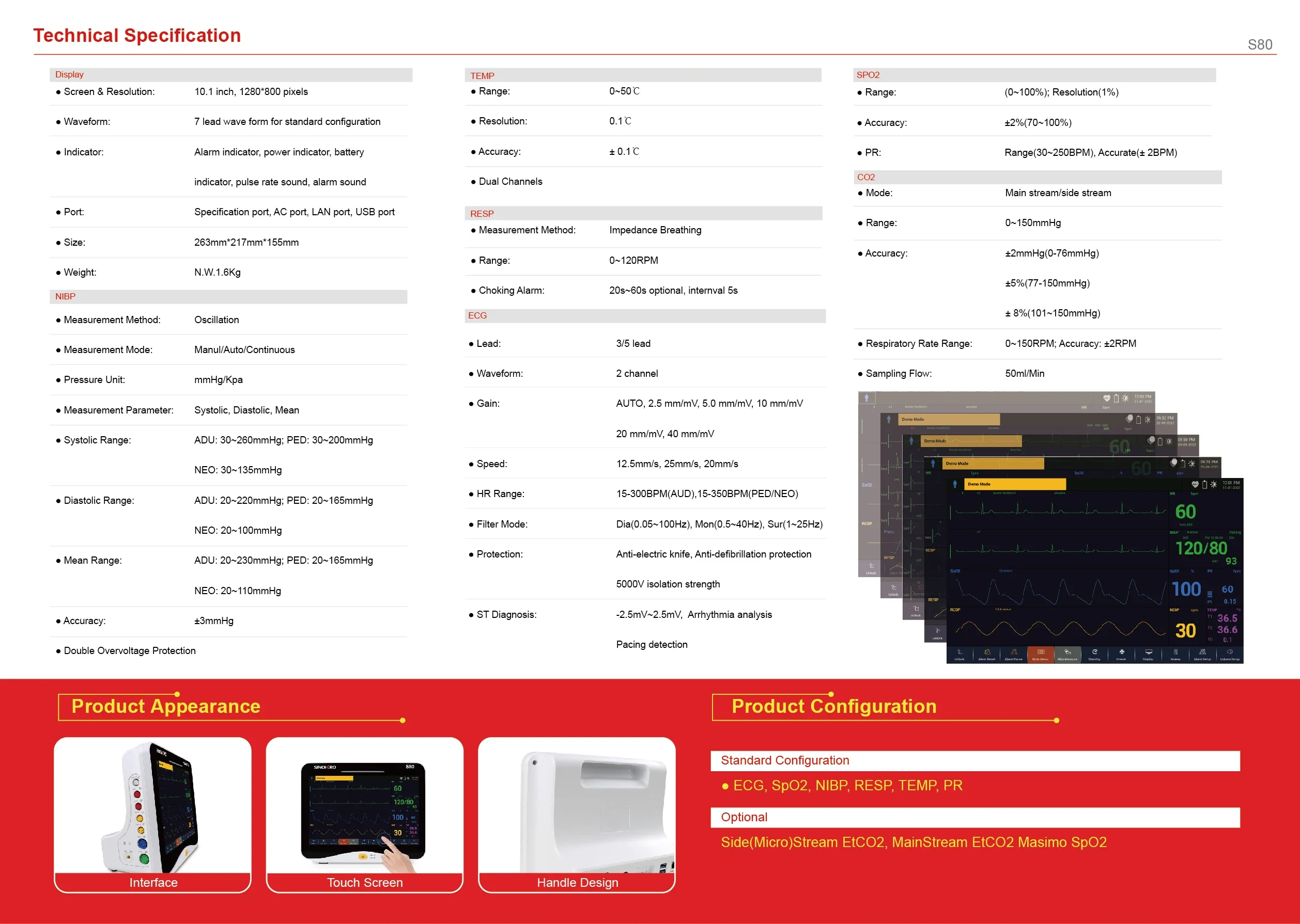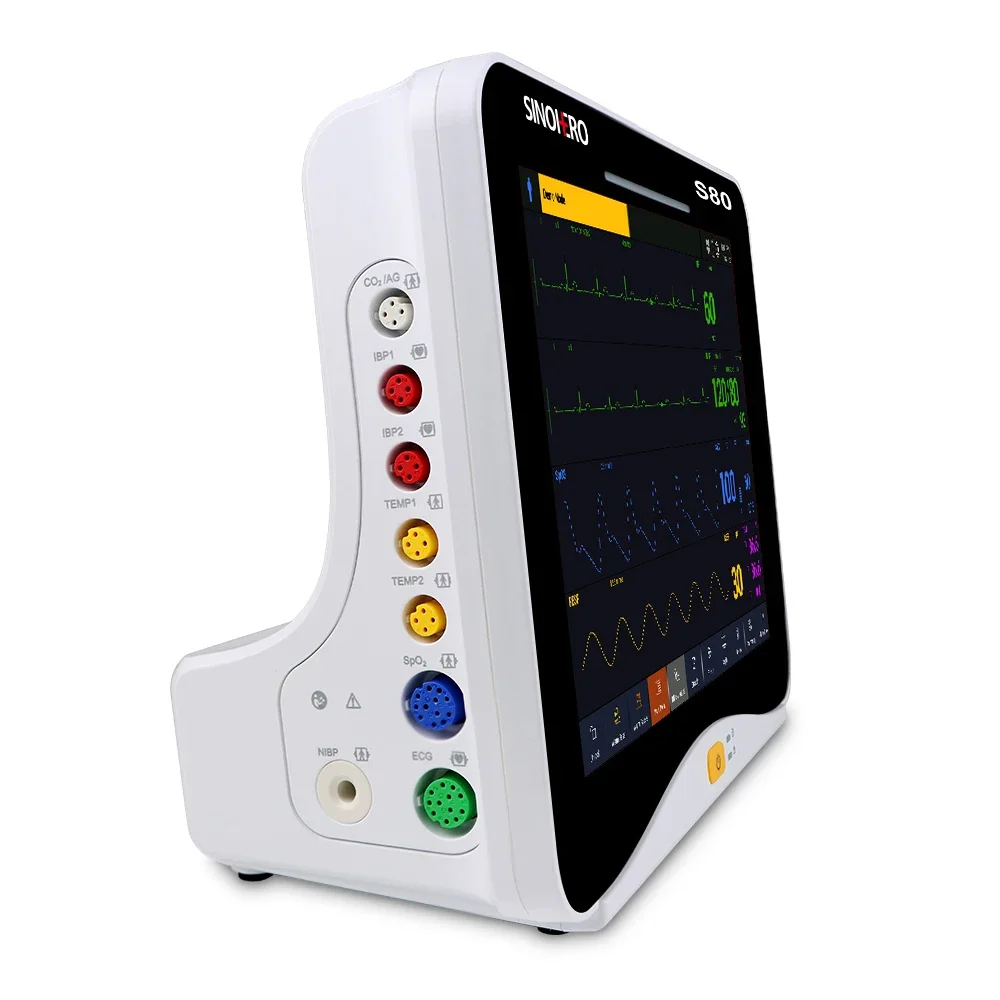 Monitor de paciente multiparámetro S80 de 10,1''. El monitor tiene abundantes funciones que se pueden utilizar para monitoreo clínico con adultos, pediátricos y recién nacidos.Los usuarios pueden seleccionar diferentes configuraciones de parámetros según los diferentes requisitos.