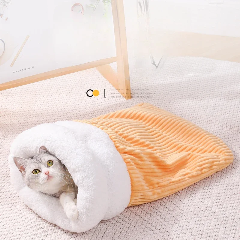 5.Cálido en todos los sentidos de 360 grados: nuestro saco de dormir para gatos es un refugio semicerrado que envuelve a su gato en una comodidad de 360 grados, brindando un santuario seguro y cálido ideal para la temporada más fría y puede mantener al gato abrigado en el invierno.