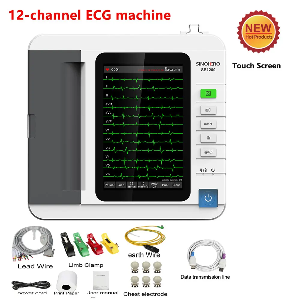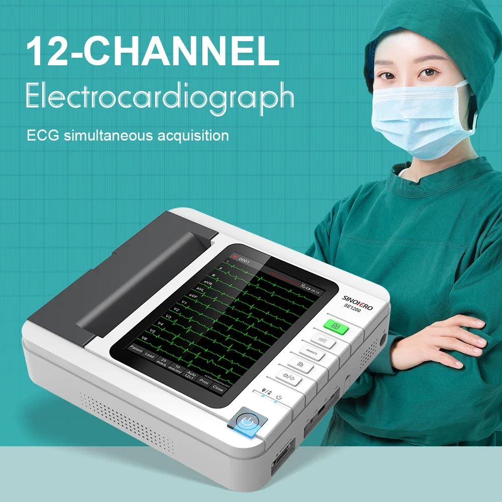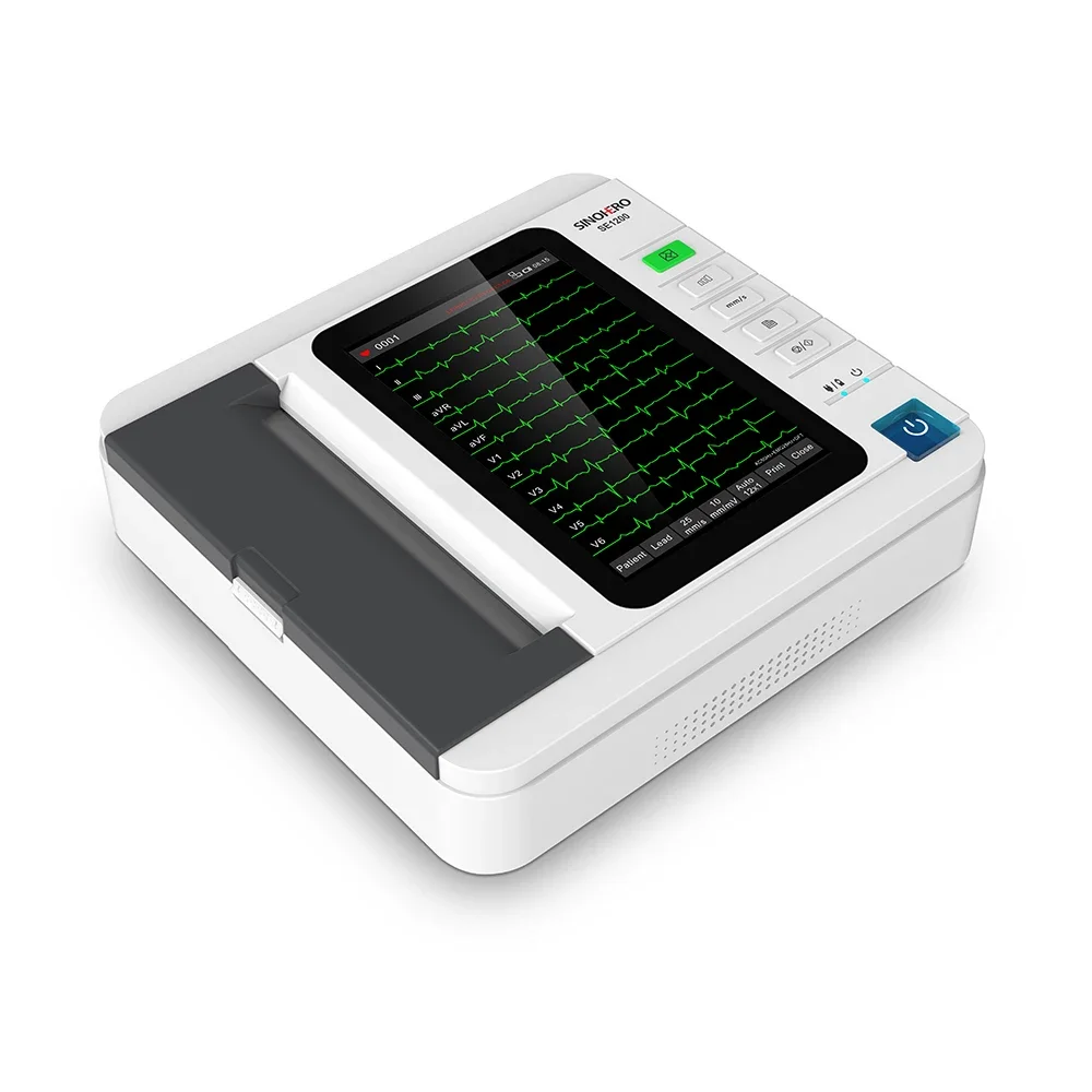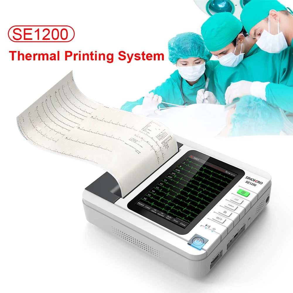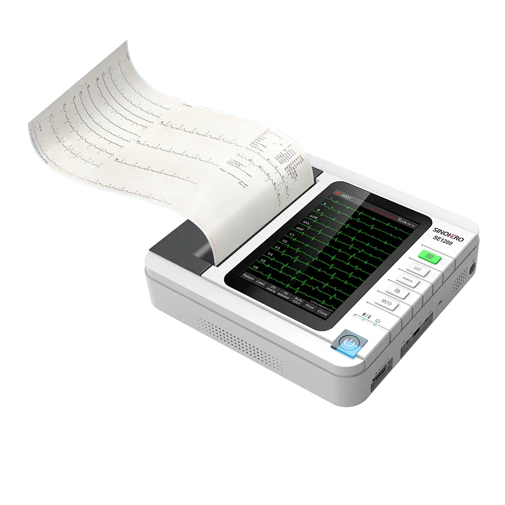 SE1200 es un electrocardiógrafo con pantalla HD colorida de 12 canales que puede recopilar señales de ECG de 12 derivaciones e imprimir formas de onda mediante el sistema de impresión térmica.
