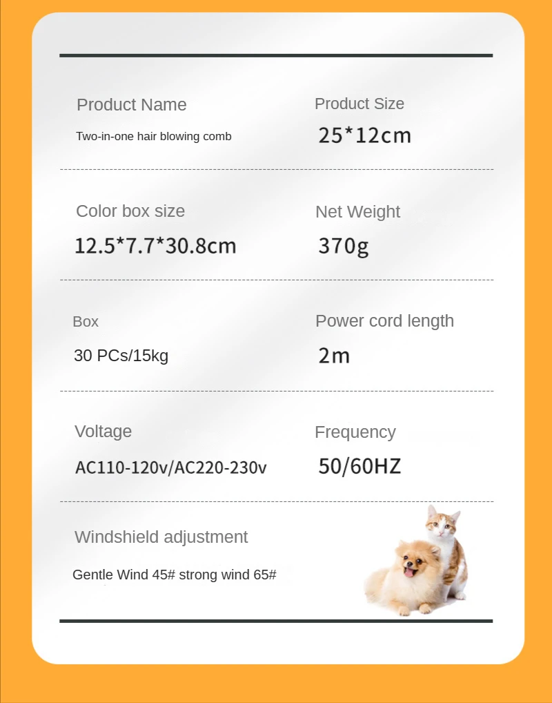 Presentamos el secador de perros 2 en 1, la herramienta de aseo definitiva para tu amigo peludo. Hecho con materiales de alta calidad, este secador para mascotas es perfecto para mantener el abrigo de tu mascota limpio, saludable y brillante. El diseño 2 en 1 incluye un secador y un cepillo de peine, que seca y cepilla el pelaje de su mascota simultáneamente, ahorrándole tiempo y esfuerzo.