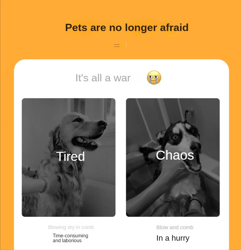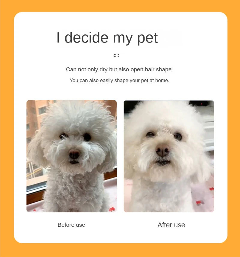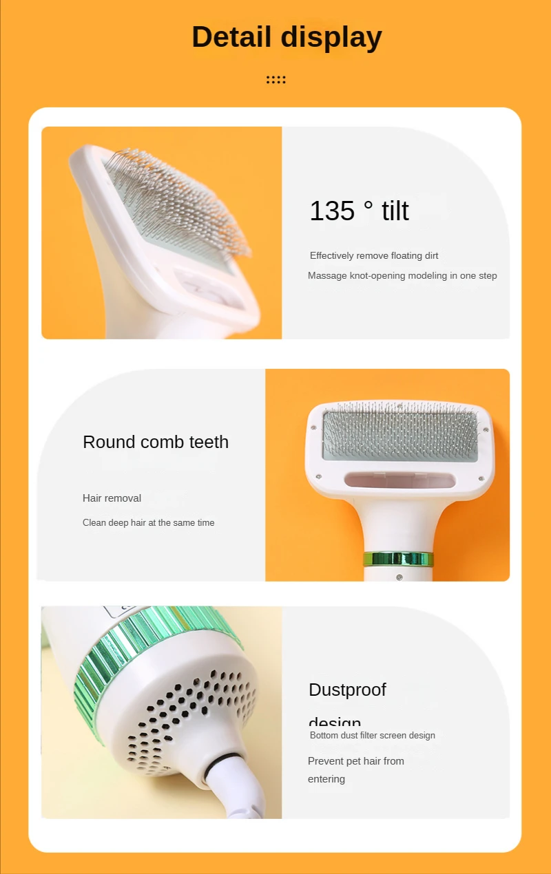 El secador para mascotas está equipado con un motor de bajo ruido, lo que garantiza una experiencia de aseo tranquila tanto para usted como para su mascota. La función de control de temperatura le permite ajustar la configuración de calor de acuerdo con las necesidades del pelaje de su mascota, lo que garantiza una experiencia de secado segura y suave. El cepillo de peine está diseñado para eliminar enredos, nudos y pelaje suelto, haciendo que el pelaje de su mascota sea suave y fácil de manejar.