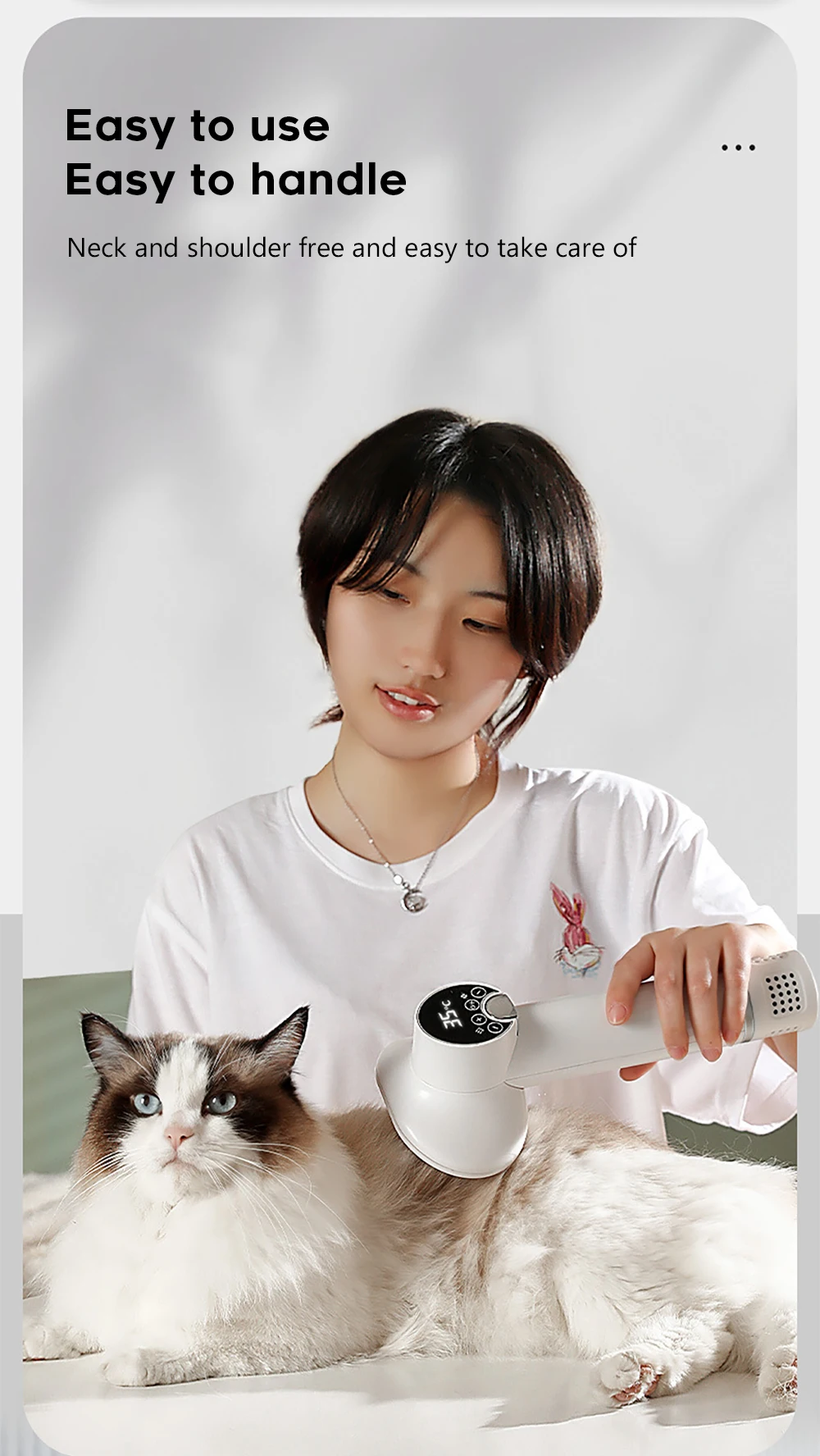 【 3 Ajustes de temperatura】 Las temperaturas frías, bajas y altas pueden ayudar a secar a sus mascotas rápidamente, ahorrando energía y son adecuadas para prevenir el dolor y las quemaduras. Se sugiere que el ajuste bajo sea el primero, para ser menos cálido y más cómodo. El secador de pelo para mascotas diseñado específicamente para perros y gatos pequeños y medianos, funciona muy bien para perros que tienen miedo al soplador. 【Diseño de depilación de una tecla 】El nuevo diseño de depilación de una tecla le permite usar el secador de pelo para mascotas de manera más conveniente. Puede quitar fácilmente el pelo de la mascota simplemente presionando el botón.