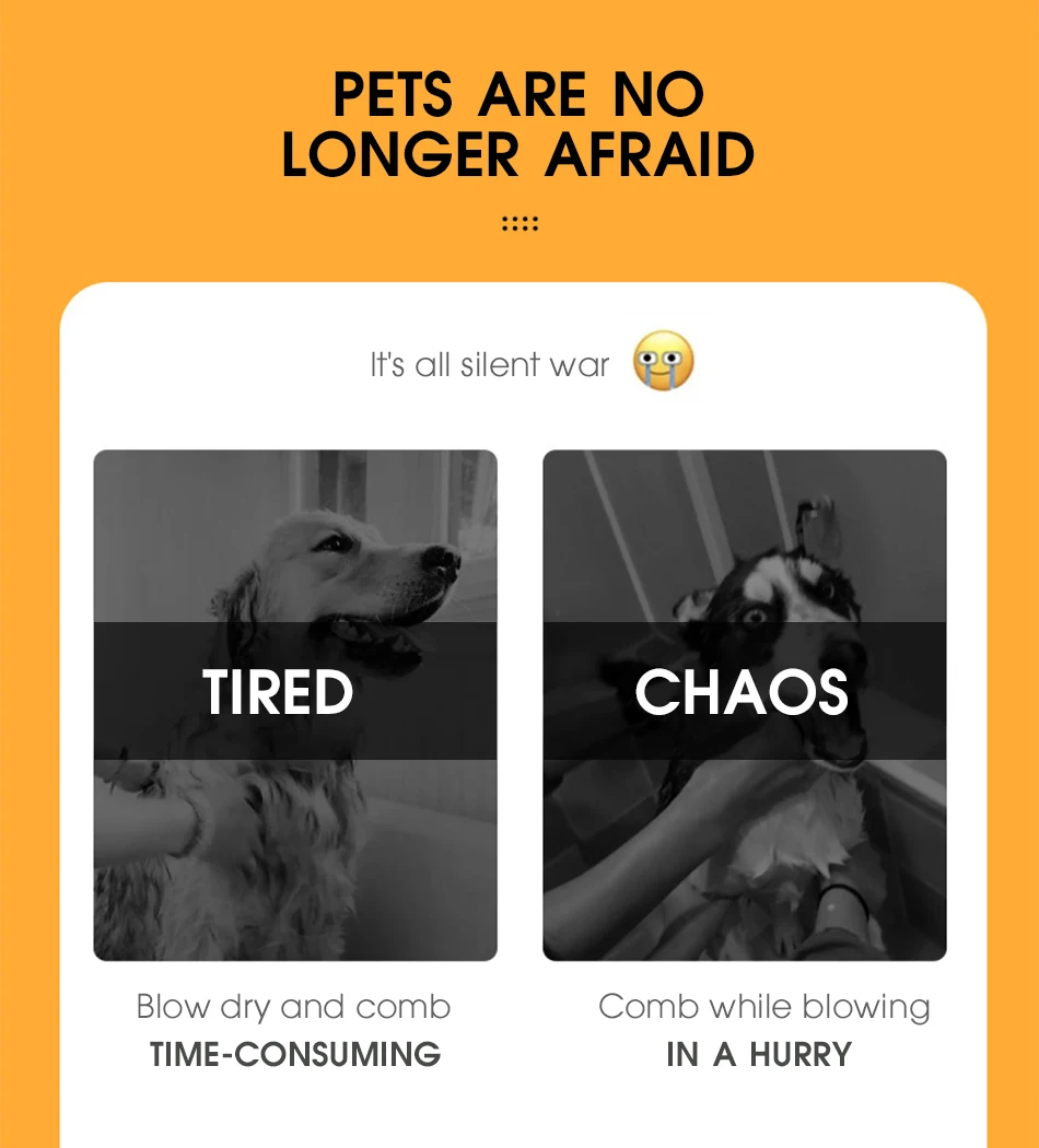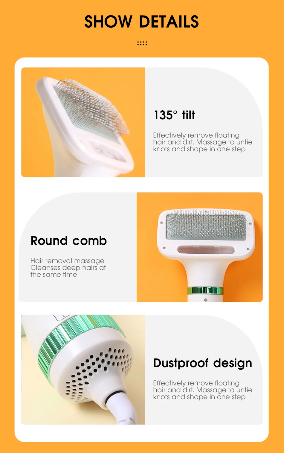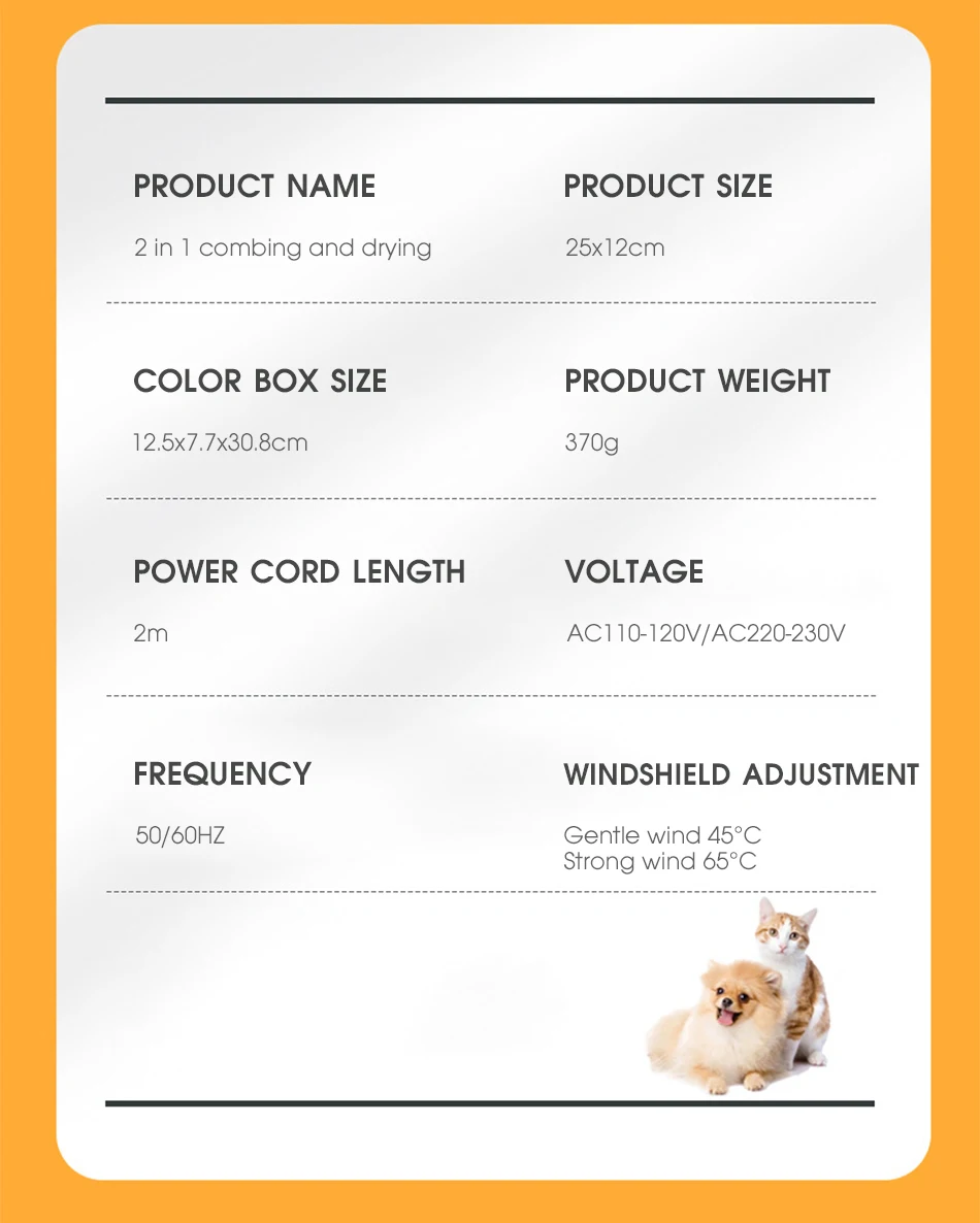 【Función 2 en 1 】Este ingenioso producto combina secador de pelo y peine para mascotas. El secado y el aseo de las mascotas se realizan al mismo tiempo.