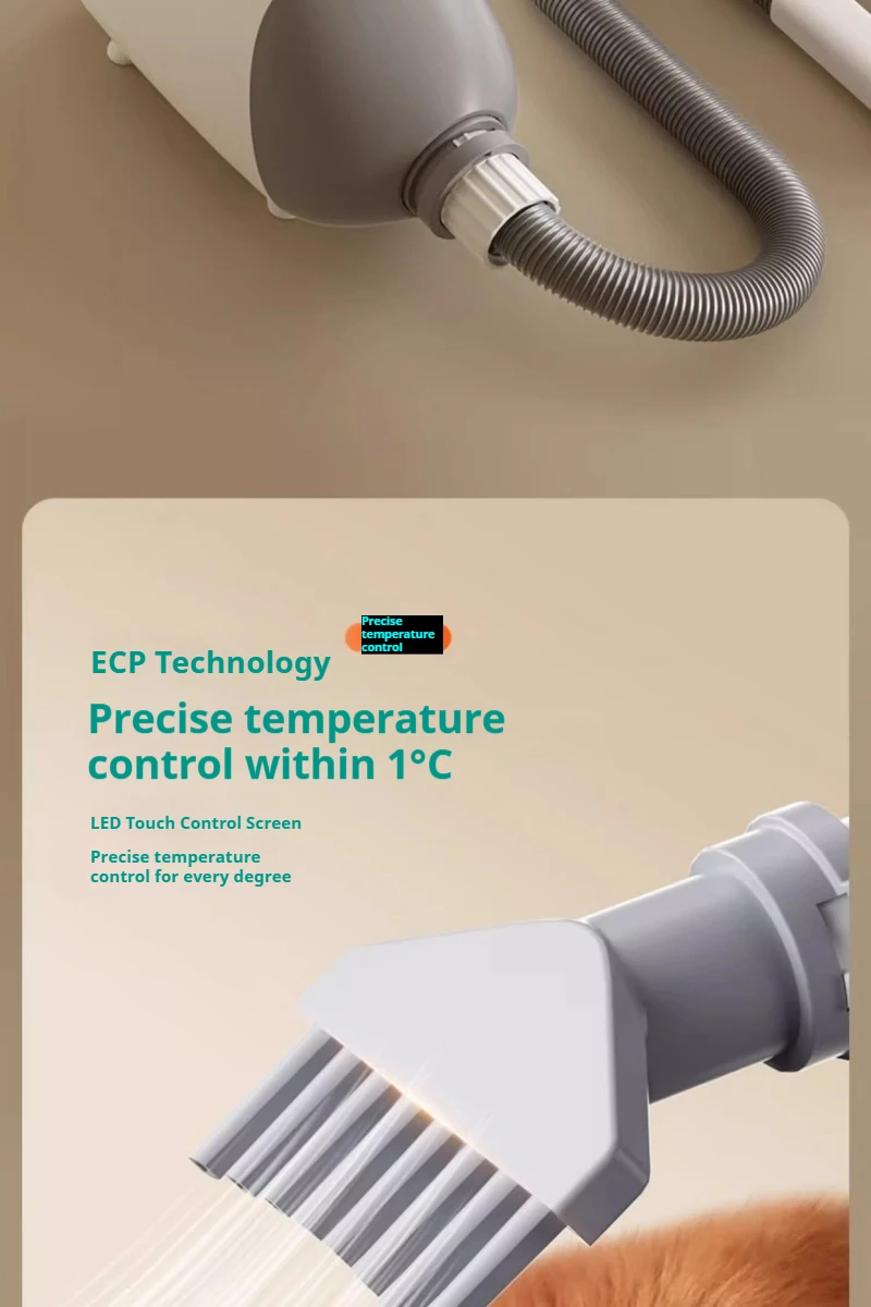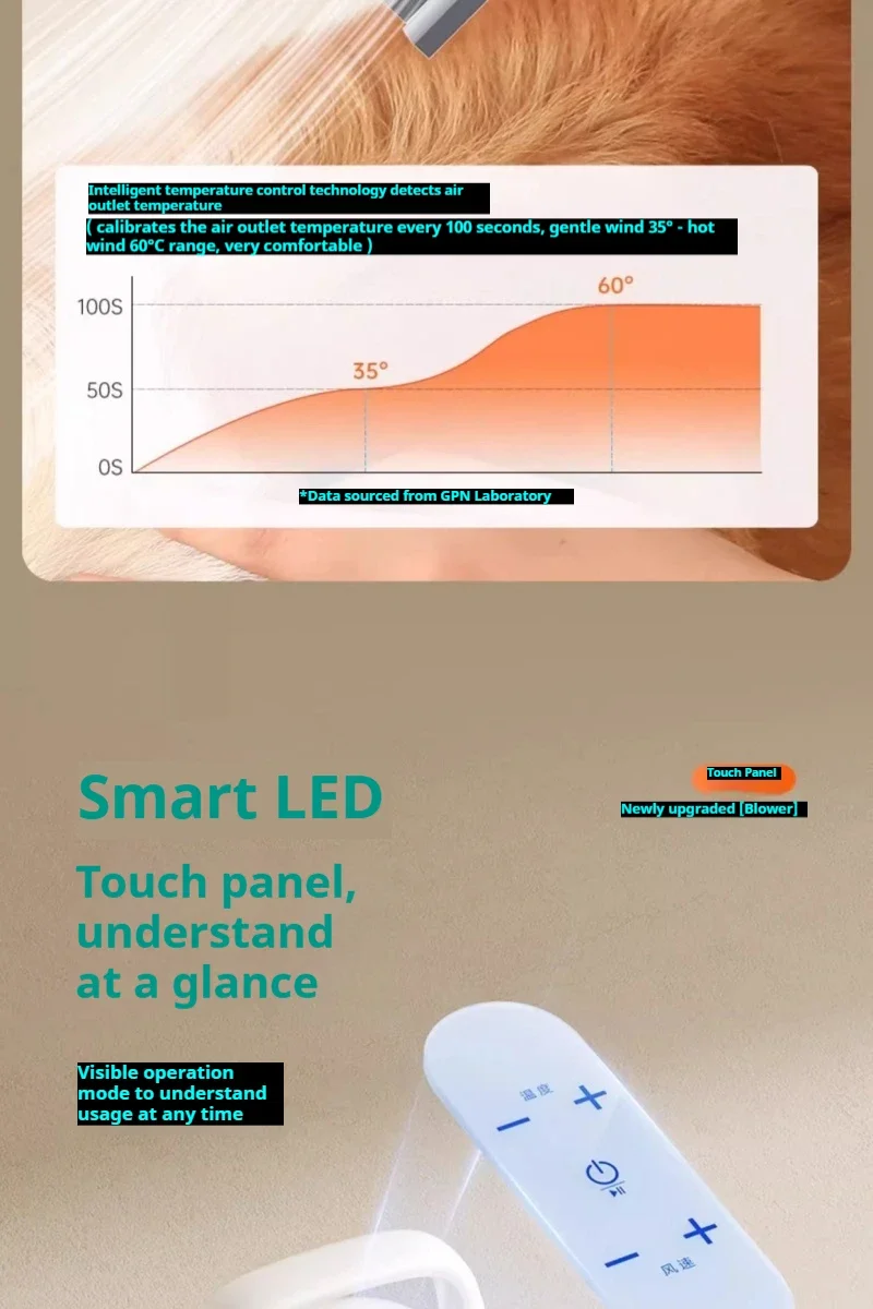 Control inteligente de temperatura y regulación de velocidad: Tanto las versiones MAX como PRO admiten un control preciso de temperatura (error 1℃) y regulación de velocidad.La pantalla táctil LED es fácil de operar y el viento suave es de 35℃ a 60℃ Se puede ajustar de manera flexible para adaptarse a diferentes estados de cabello de las mascotas, evitando daños por altas temperaturas al cabello y quemaduras en la piel.