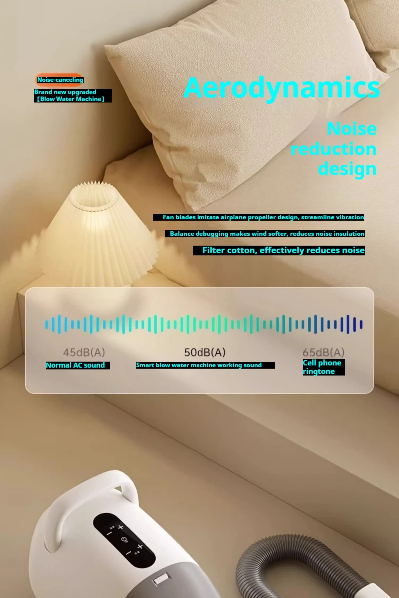 Funcionamiento con poco ruido, reducción de la tensión: al adoptar un diseño aerodinámico de reducción de ruido, el ruido de funcionamiento es de aproximadamente 50 dB (similar al sonido de los electrodomésticos inteligentes que funcionan), mucho más bajo que el timbre de los teléfonos móviles, lo que reduce la respuesta de tensión y tensión de las mascotas al soplar, facilitando el proceso de secado.