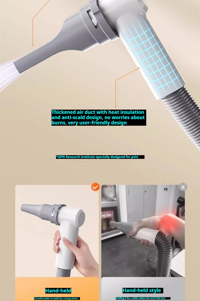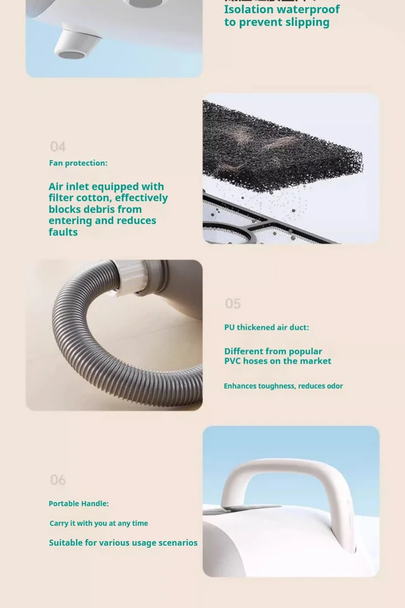 Portátil y duradero: el cuerpo de material ABS es liviano y fácil de levantar (con un peso neto de 2.24 kg) y el conducto de aire de PU de espesor tiene una gran dureza y poco olor, lo que lo hace conveniente para uso doméstico o para llevar al aire libre (como tiendas de belleza para mascotas y fomentar lugares de cuidado).
