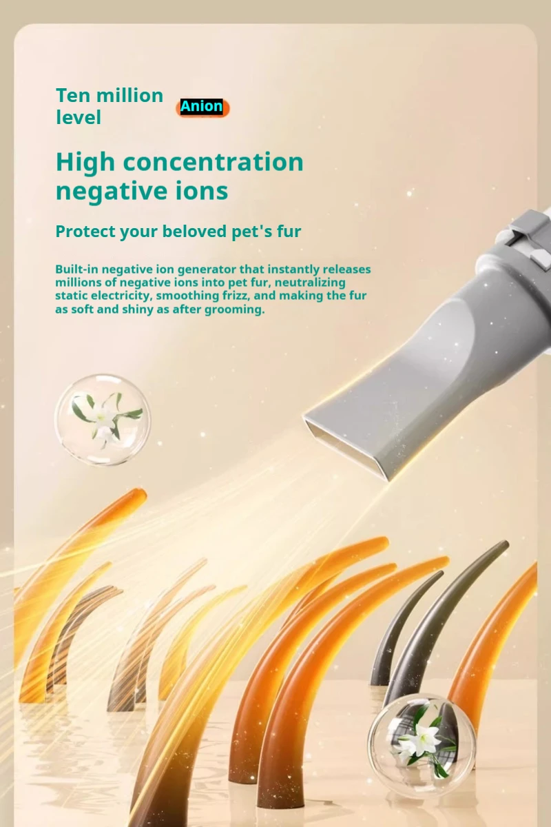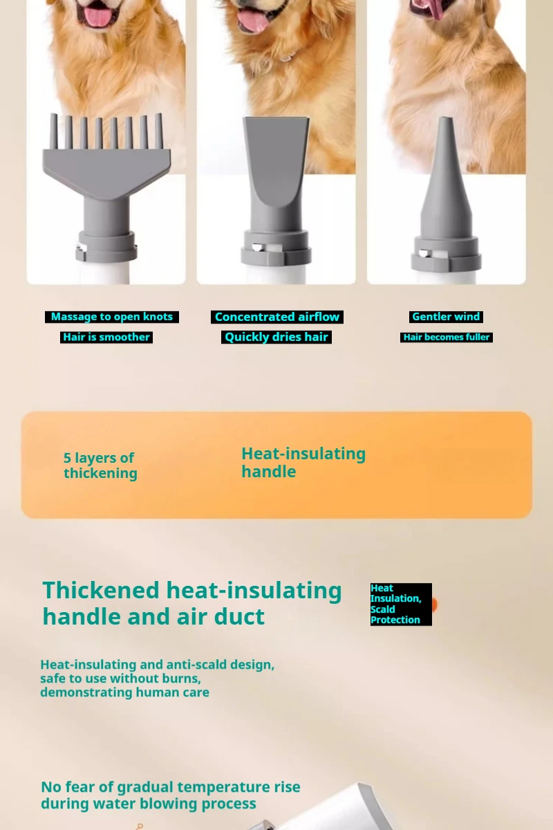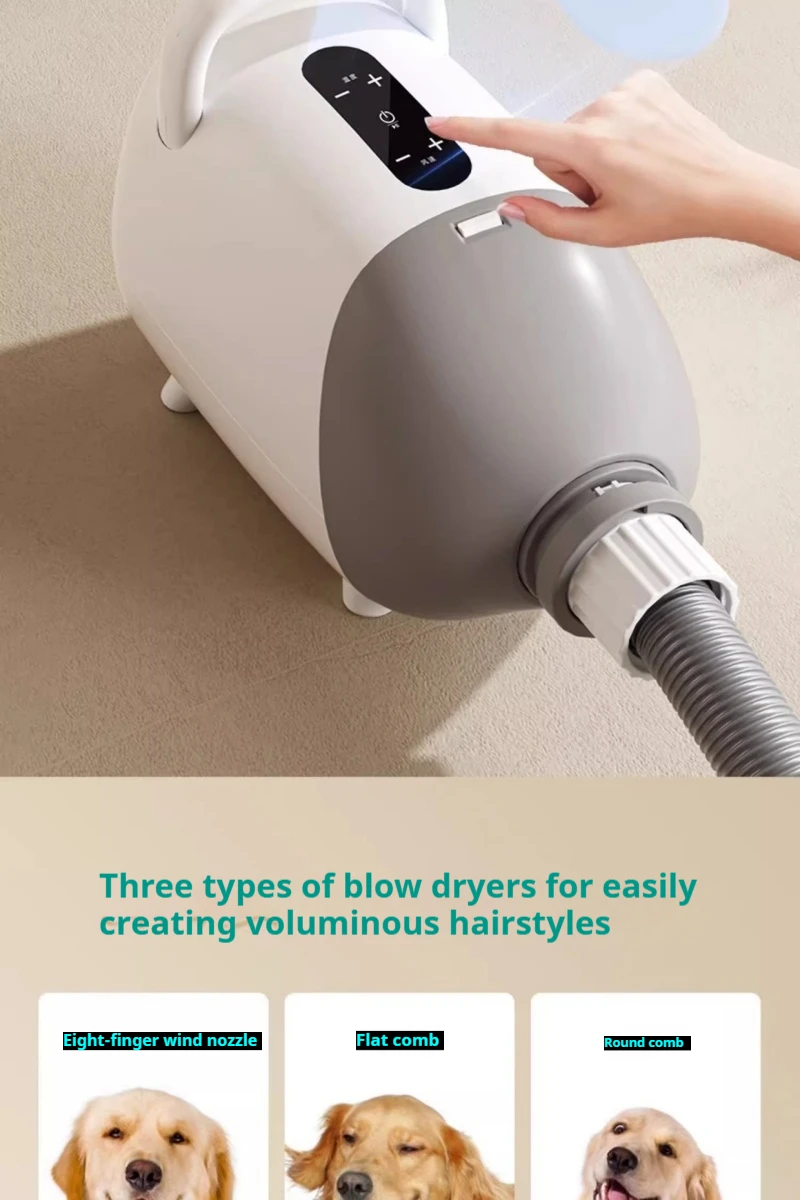 Boquillas diversas, adaptadas a necesidades específicas: Equipadas con peines planos, boquillas de ocho dedos, peines redondos y otros tipos de boquillas, proporciona un suministro de aire preciso y un secado profundo para diferentes partes de las mascotas (como abdomen, espalda, piernas) y cabello longitudes y también puede ayudar a cuidar el cabello.