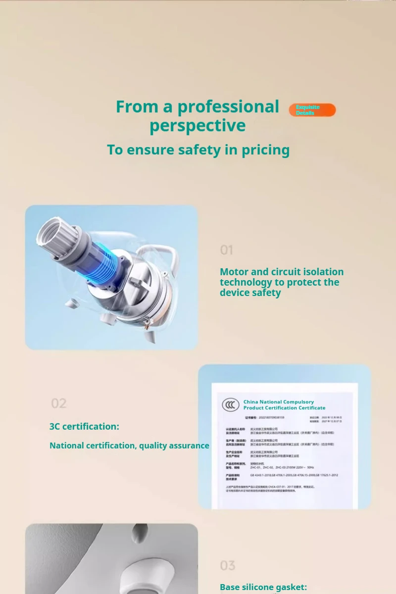 Múltiples garantías de seguridad: la tecnología de aislamiento de motores y circuitos, combinada con la certificación 3C, garantiza un uso más seguro;Junta inferior de silicona, antideslizante e impermeable;Filtre de algodón en la entrada de aire para evitar la entrada de residuos y prolongar la vida útil de la máquina.
