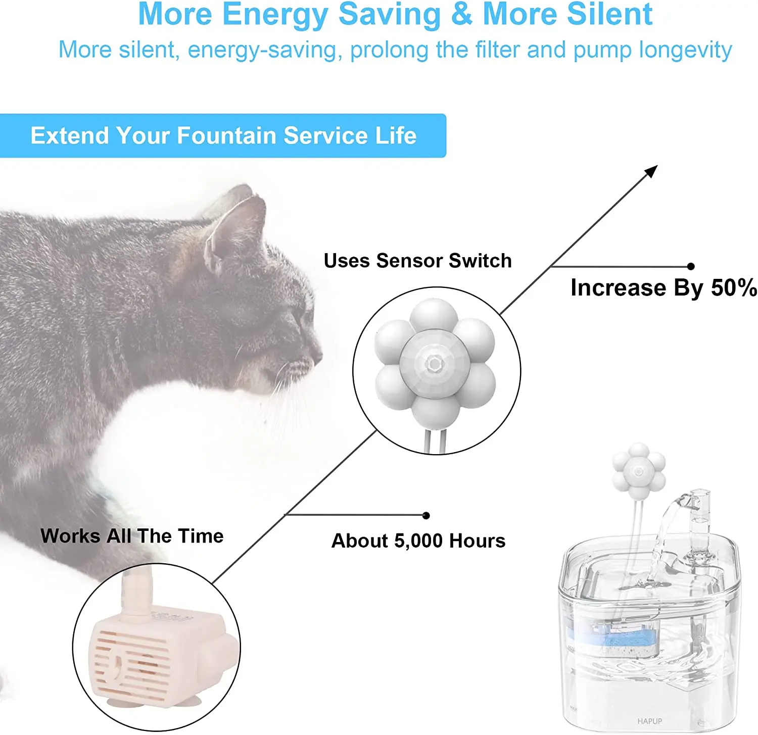 2.Ventajas: silencioso, ahorro de energía, prolonga la vida útil del elemento filtrante y de la bomba de agua, lo que puede atraer mejor a las mascotas a beber más agua.