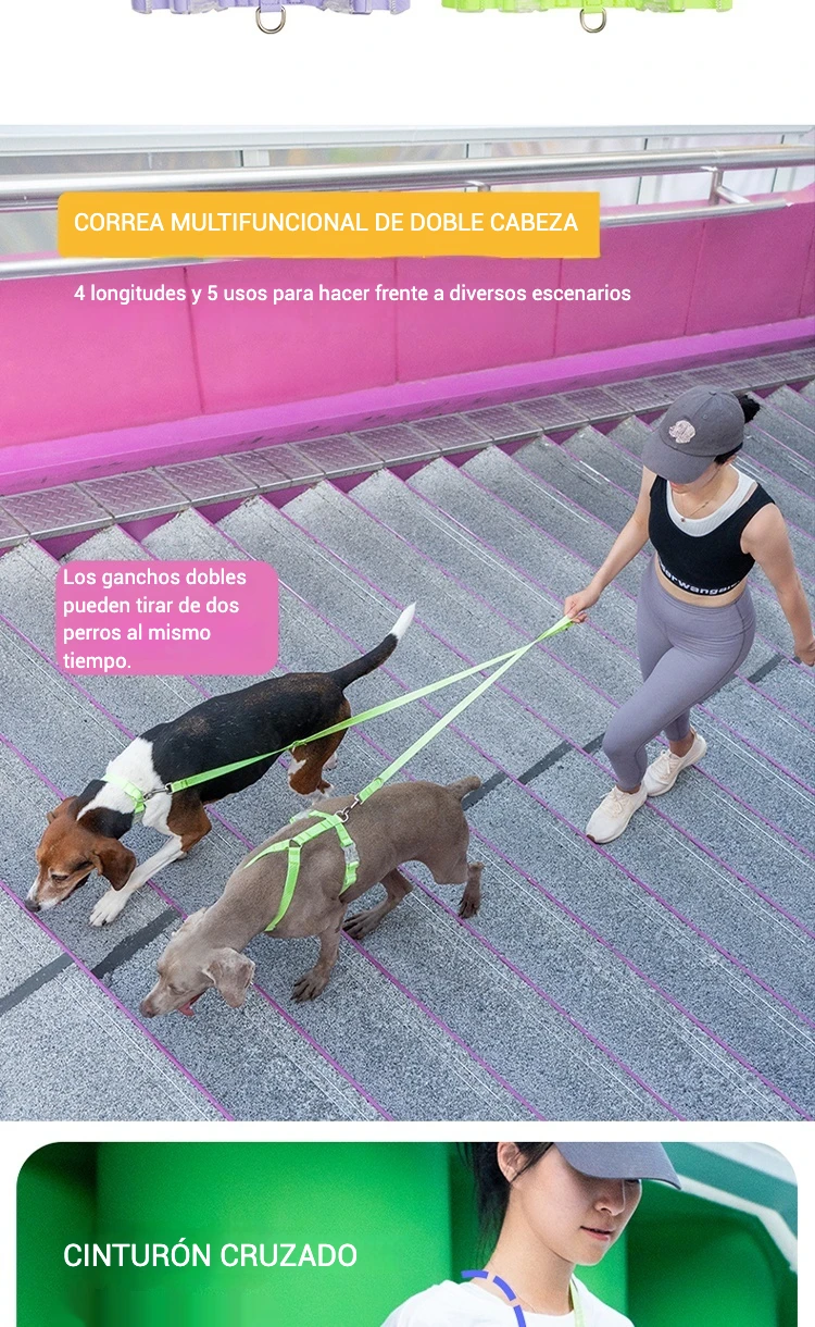 🌟5.Correa de doble gancho: Cuenta con ganchos duales para controlar a uno o dos perros a la vez, ofreciendo un mejor control para múltiples mascotas durante aventuras al aire libre.
