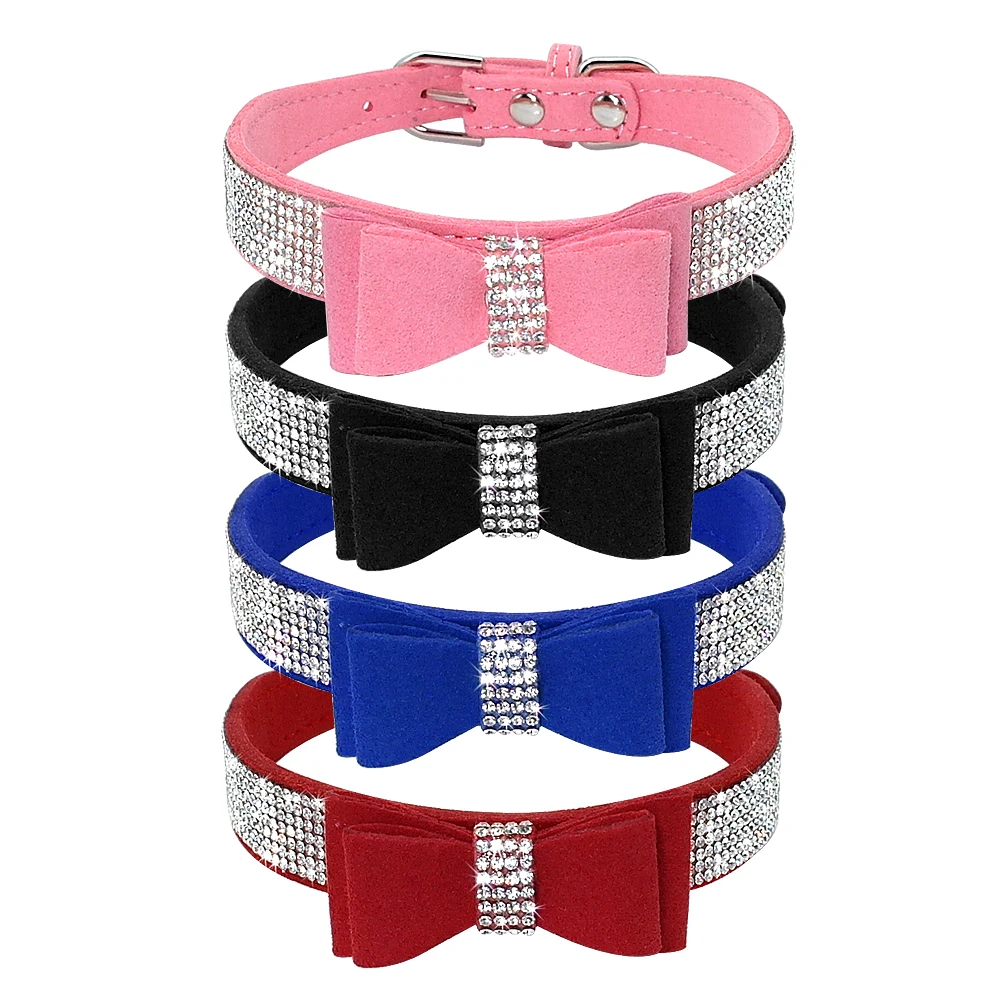 Collar de cuero suave Seude para cachorros y perros pequeños y medianos, collares de gato con lazo y diamantes de imitación ostentosos para perros pequeños y medianos, gatos, Chihuahua, color rosa, para perros y gatos