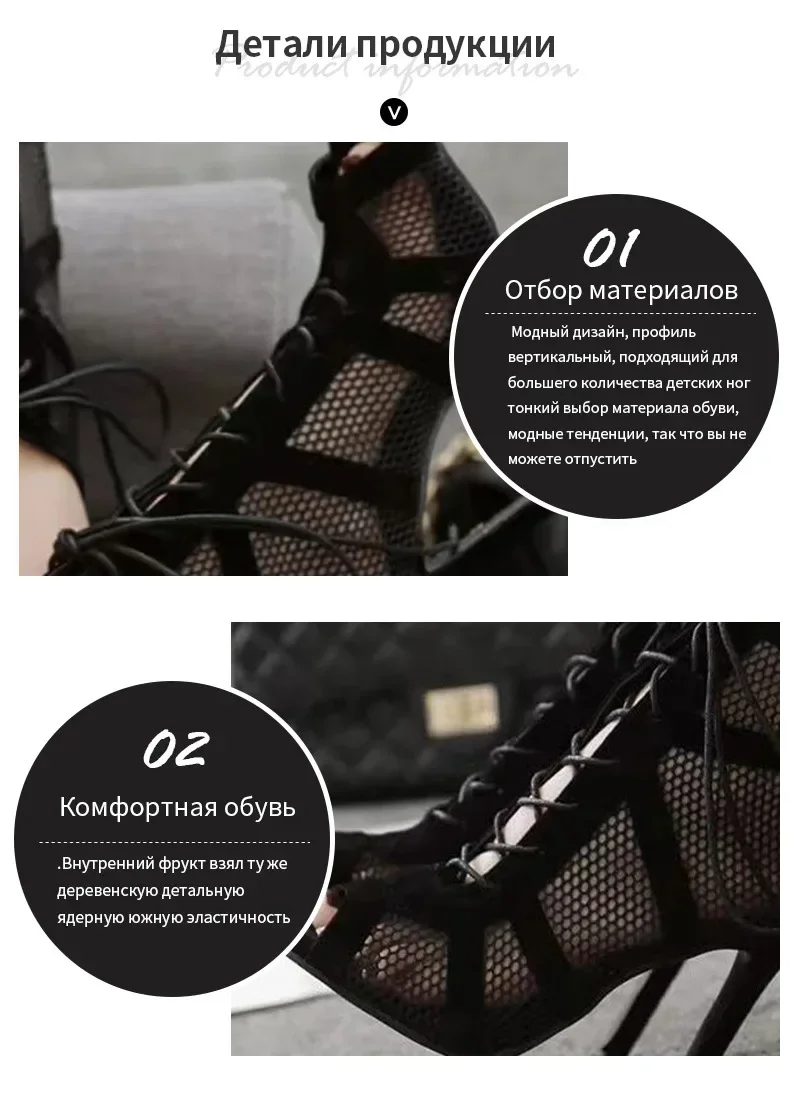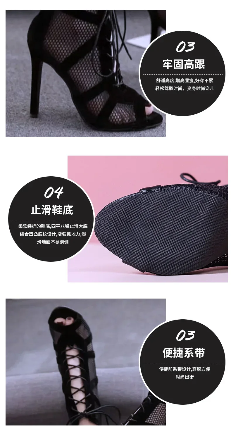 Sexy High Heels Hollow Mesh Sandals Women Summer Cross-tied Peep Toe Heeled Sandals Ankle Strap Dance Shoes Black Net Sandals
