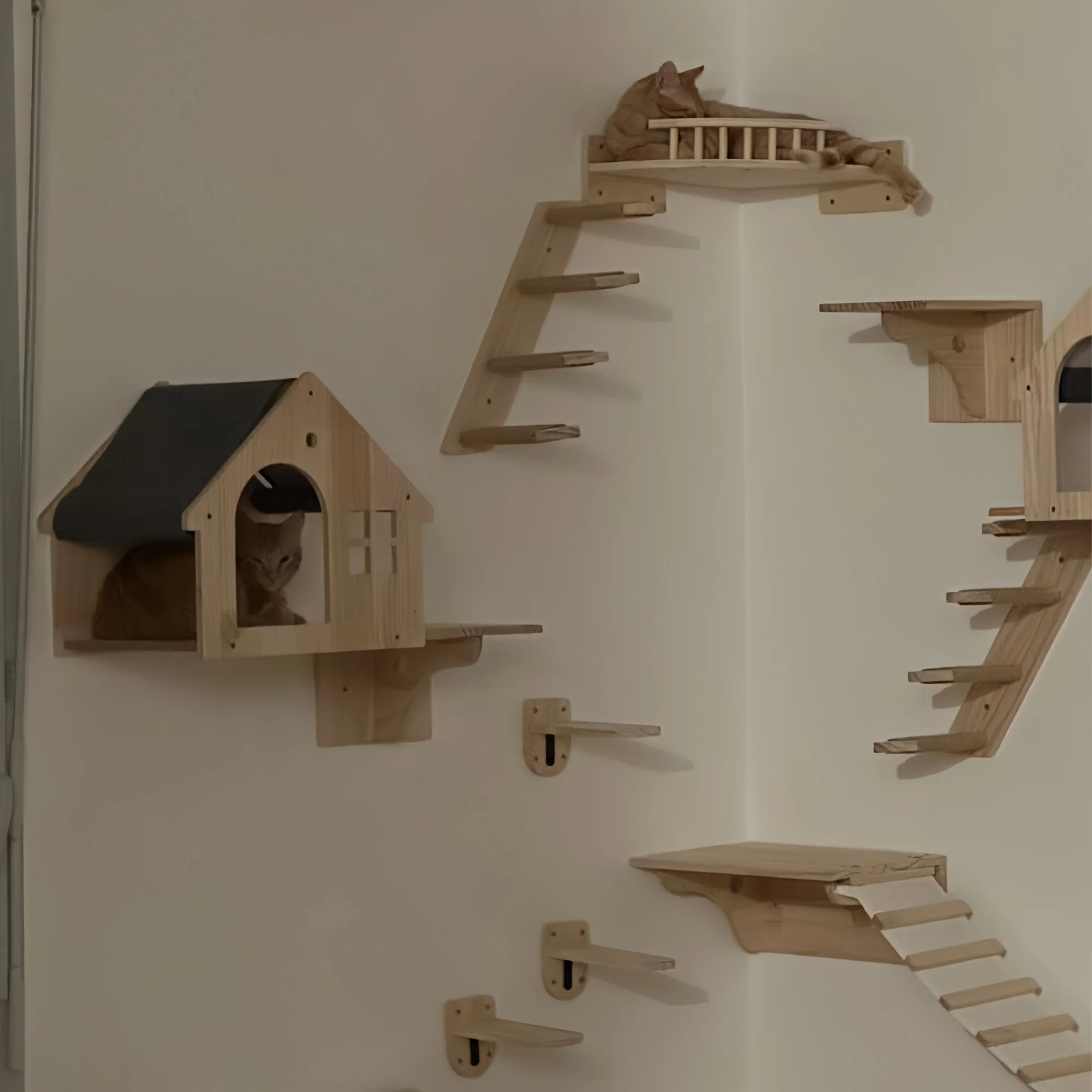 Los estantes de pared para gatos se adaptan al hábito de los gatos de escalar, aumentan el ejercicio y reduciendo la posibilidad de obesidad, lo que es bueno para la salud.Además, le da a los gatos espacio para escalar y evitar estropear la casa.