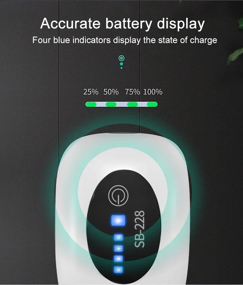 3. Presione suavemente el botón de encendido/apagado para encender la alimentación y las luces indicadoras de encendido se encenderán. Las cuatro luces indicadoras de potencia se mostrarán de acuerdo con el nivel de potencia actual (Las Cuatro luces encendidas indican 100%, tres luces encendidas indican 70%, dos luces encendidas indican 40%, Y una luz encendida indica 10%);
