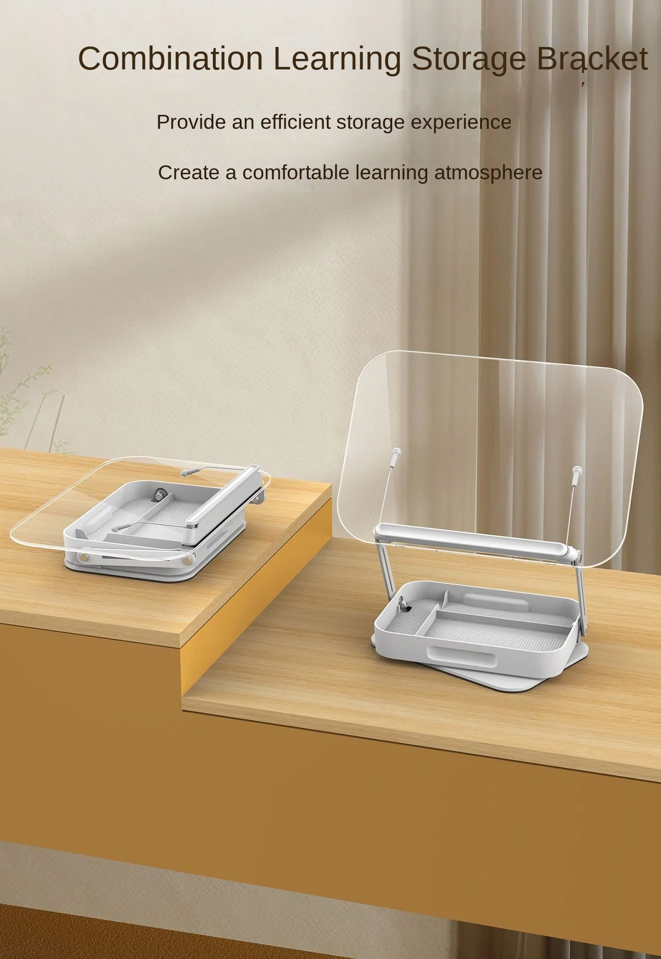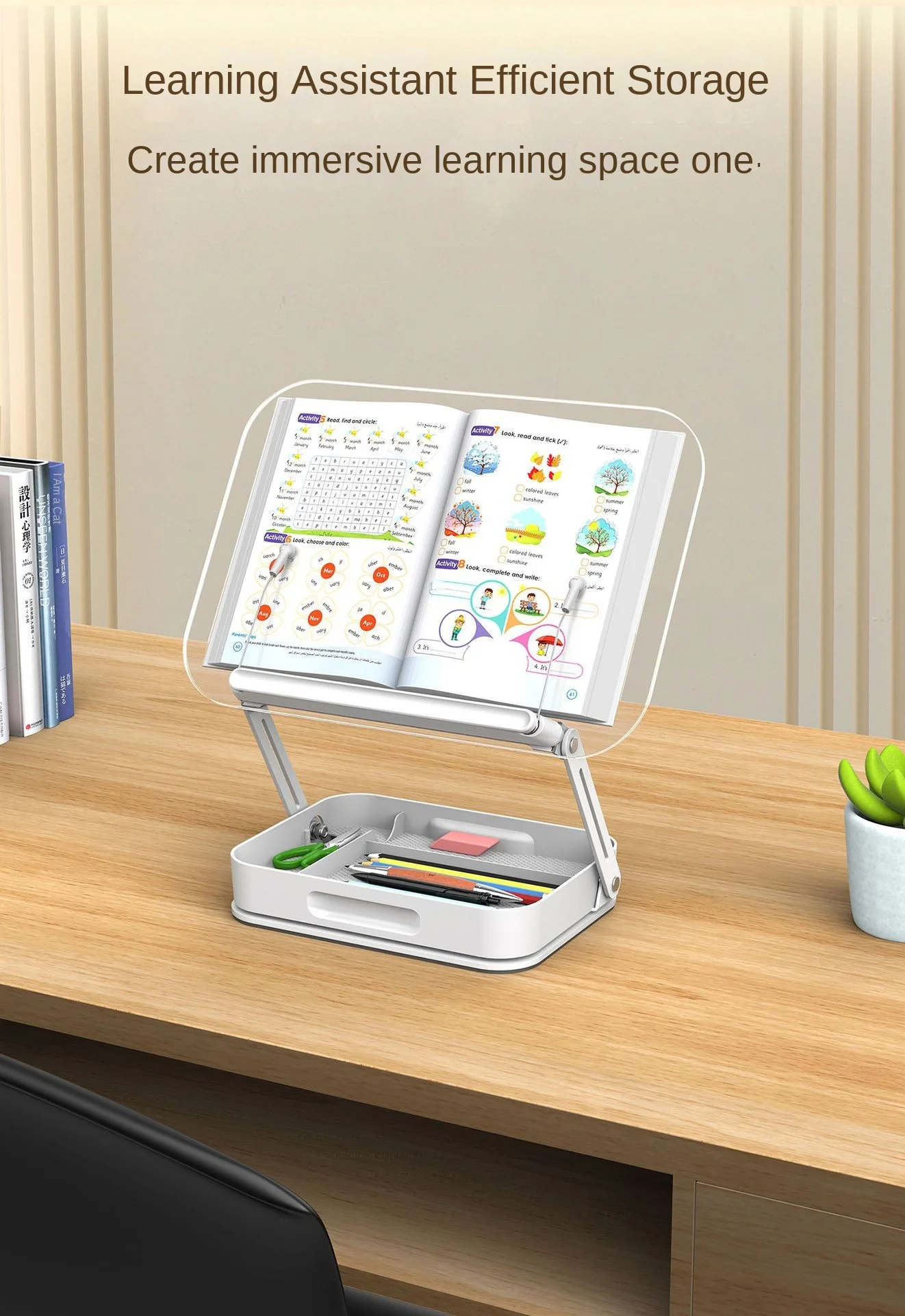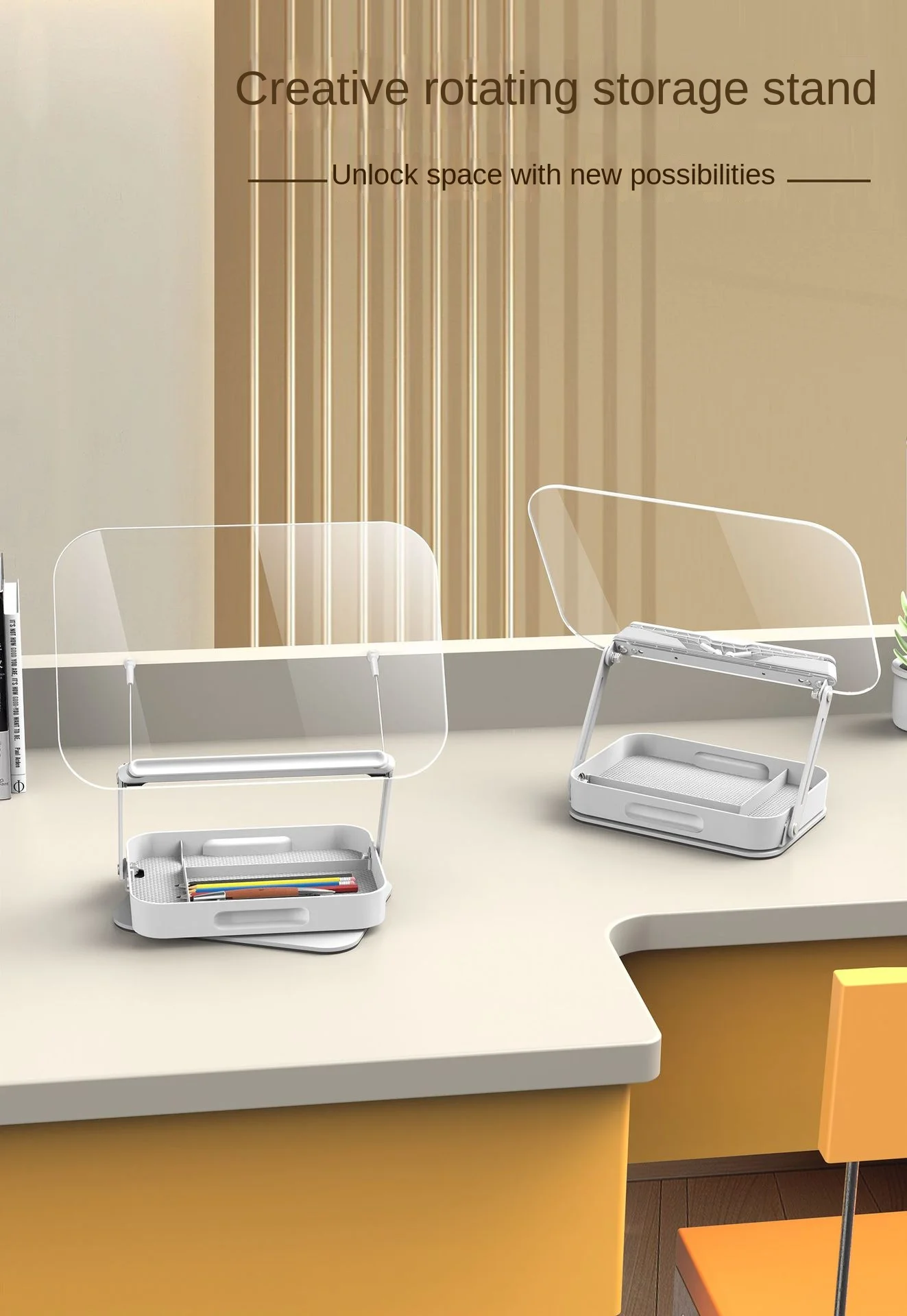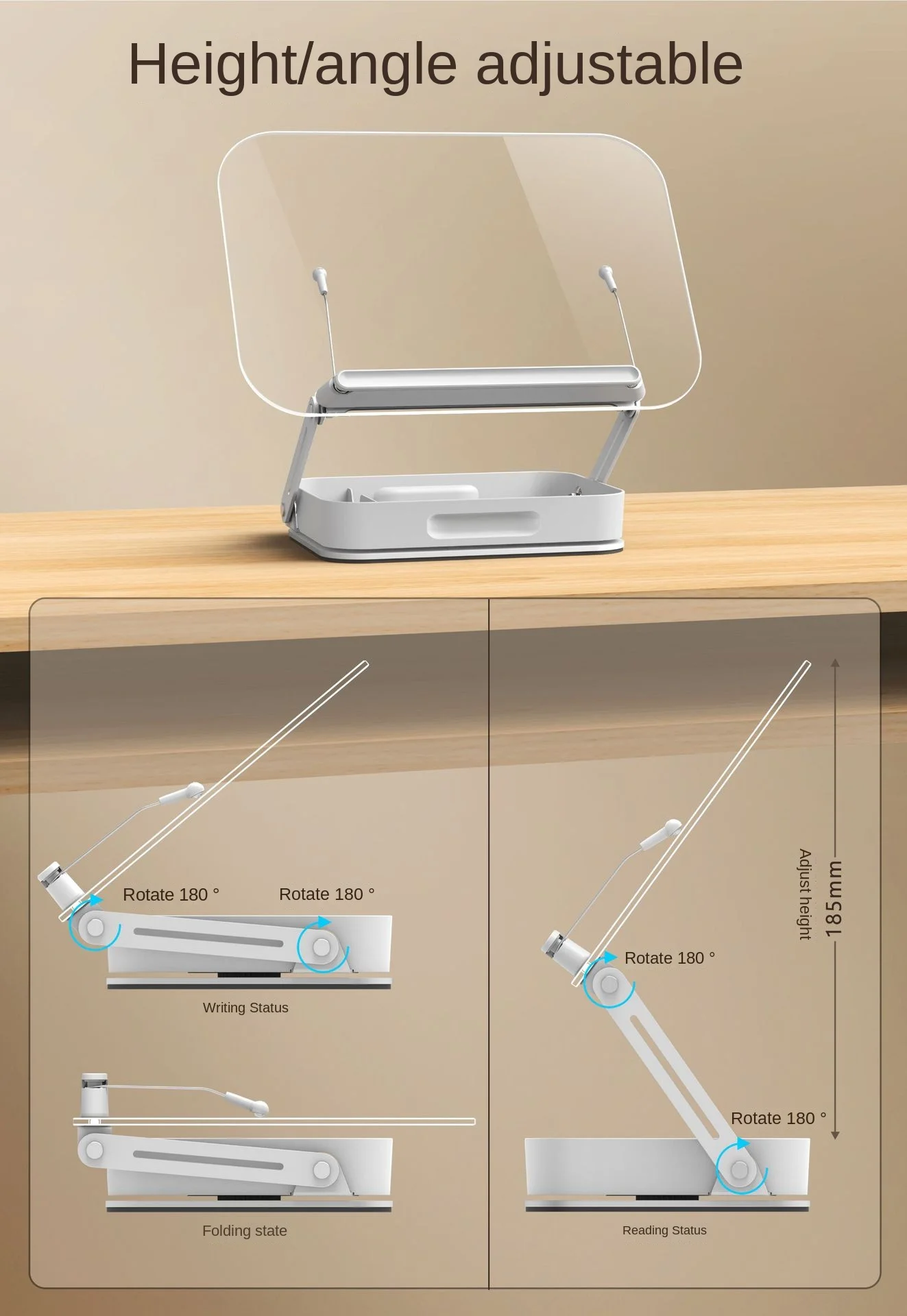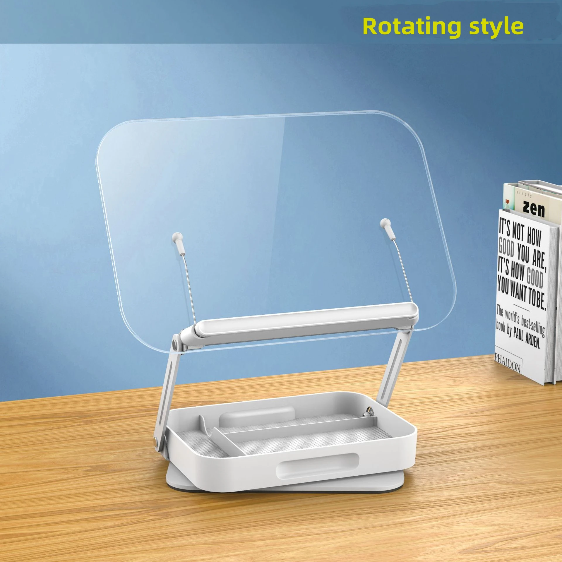 Soporte de acrílico para libros con almacenamiento, soporte ajustable para libros para leer con 360 ° Bases giratorias, soporte elevador de escritorio plegable