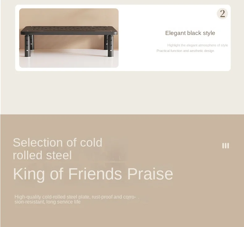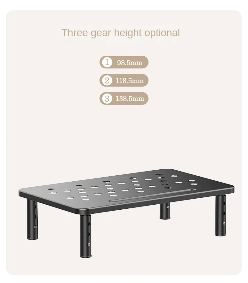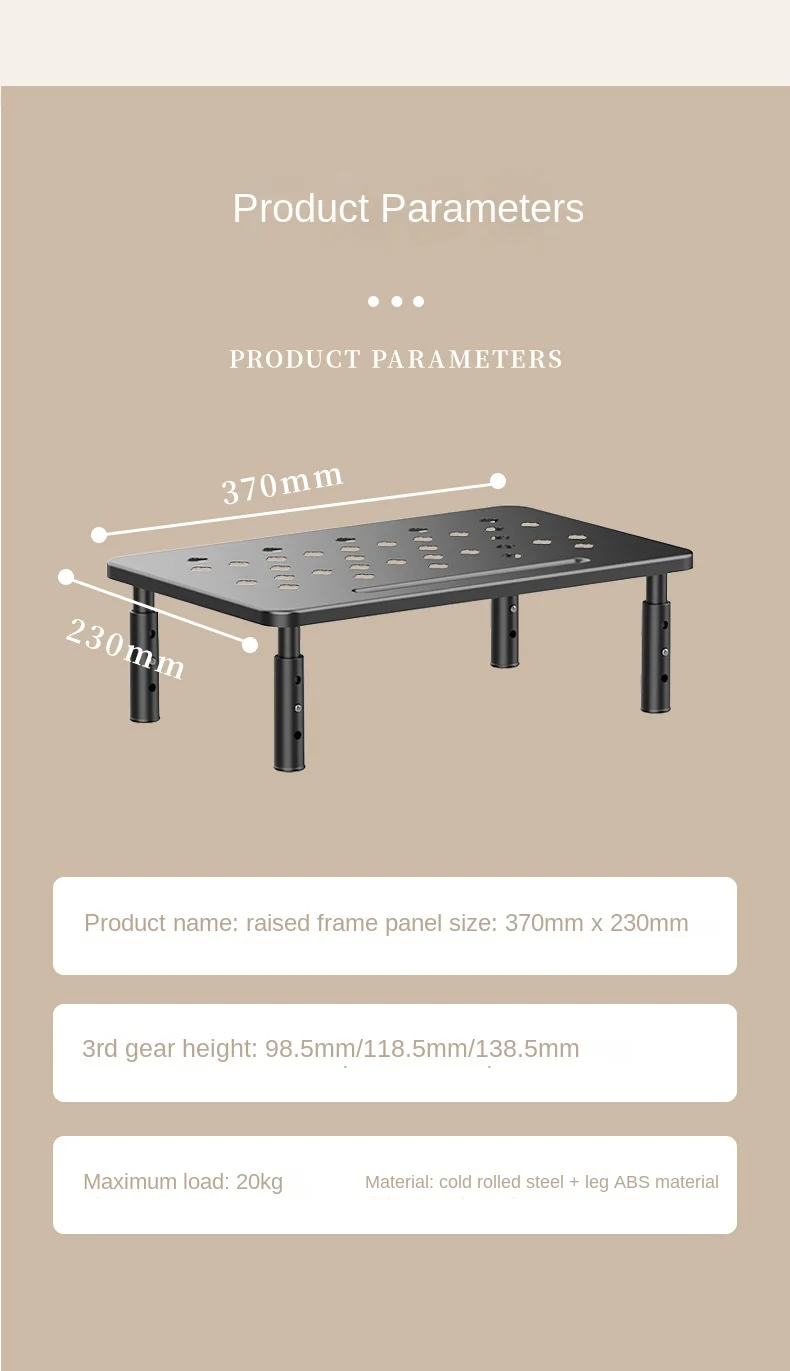 Característica: Color del producto: Negro, Blanco Tamaño del panel: 370 mm x 230 mm Altura de la tercera marcha: 98,5 mm/118,5 mm/138,5 mm Carga máxima: 20 kg Material: acero laminado en frío + material ABS de pata
