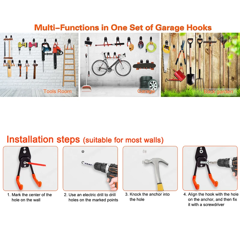 TAMAÑO MÚLTIPLE: Viene con ganchos para colgar de 5 tamaños para todas sus necesidades de almacenamiento de cobertizos. Perfecto para organizar el garaje en casa como escaleras colgantes, sillas, cochecitos, patines y bolsas de gimnasio.