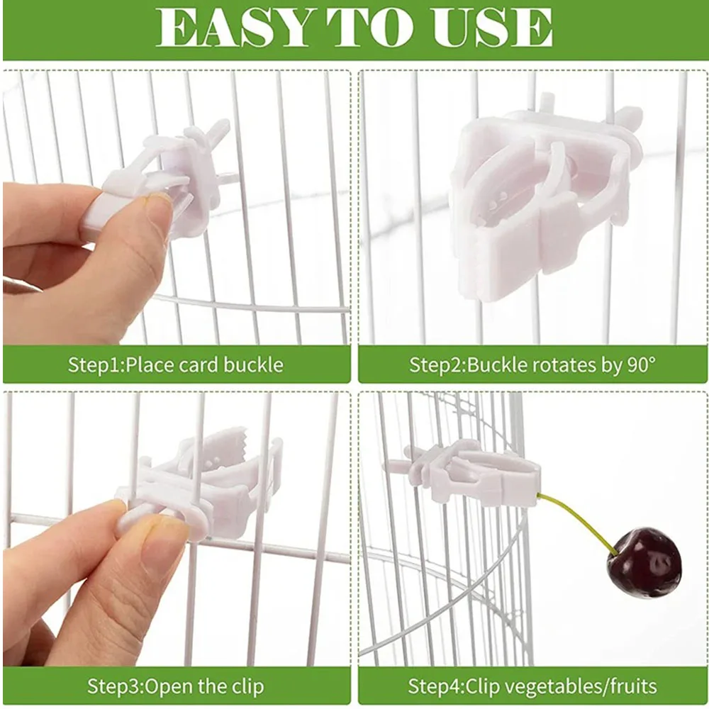 Amplia aplicación: estos clips para frutas y verduras para loros son adecuados para la mayoría de las jaulas verticales para pájaros y otras jaulas de animales pequeños, herramientas prácticas para alimentar periquitos, canarios, calopsitas, pinzones y otros pájaros de tamaño similar.
