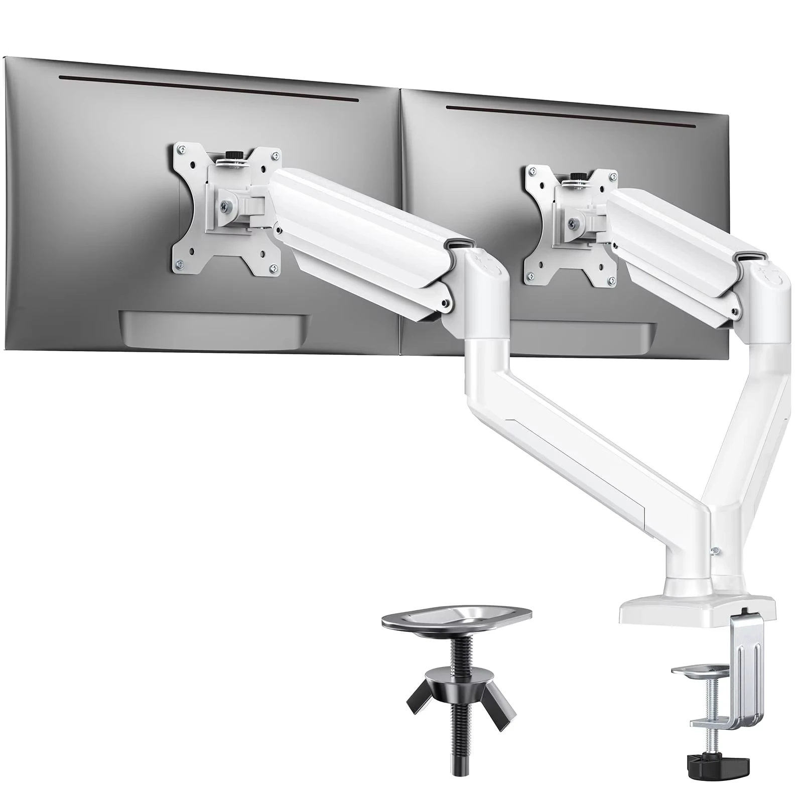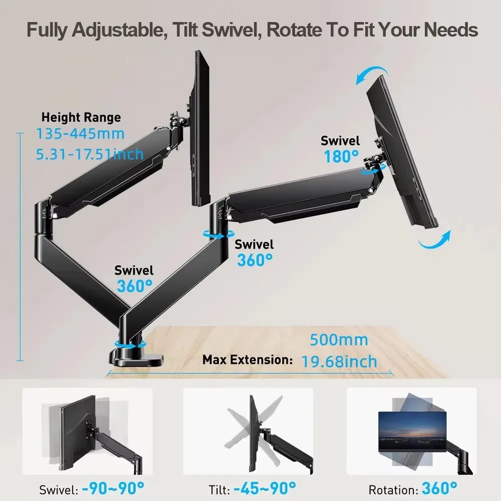 El monitor dual monta pantallas de hasta 32 pulgadas, hasta 22 libras por brazo, soporte de monitor dual ajustable, soporte de monitor dual resistente con 180° Giratorio, Inclinación, 360° Giratorio, adecuado para oficina en casa, VESA 75/100 mm