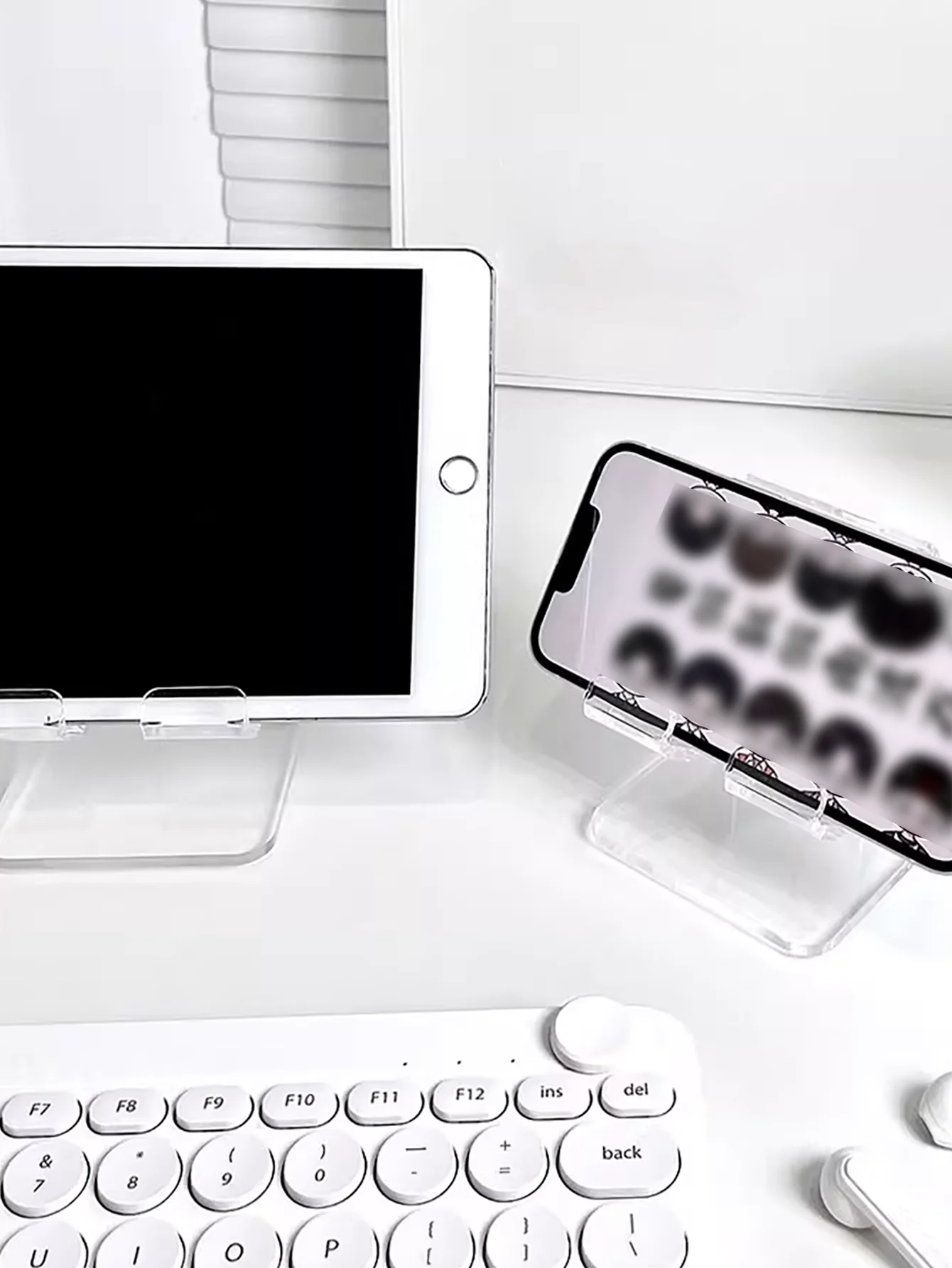Fabricado con acrílico transparente, este soporte para teléfono ofrece una superficie antideslizante que garantiza que su dispositivo permanezca en su sitio.