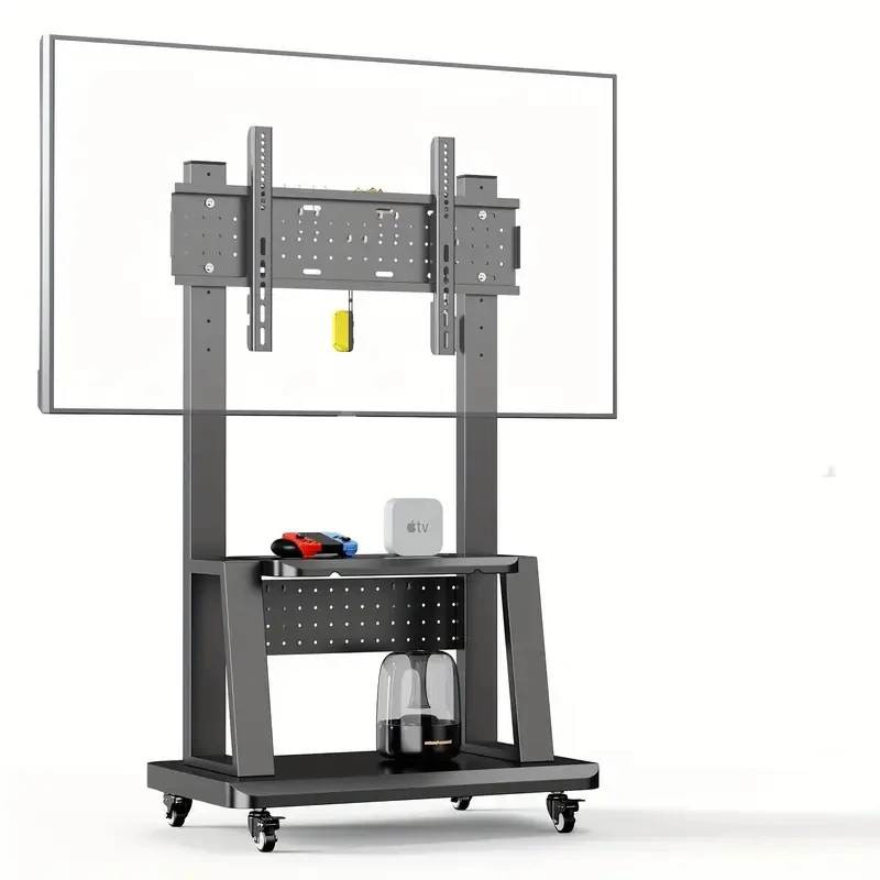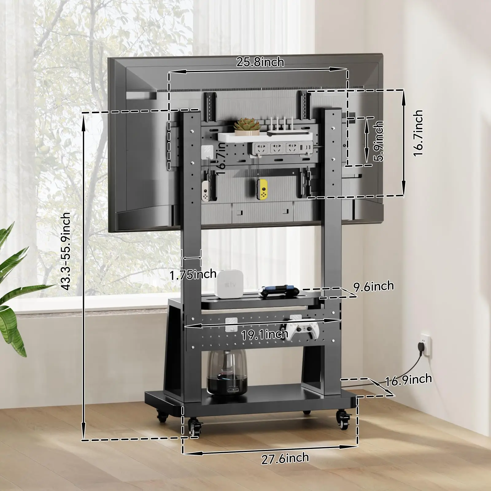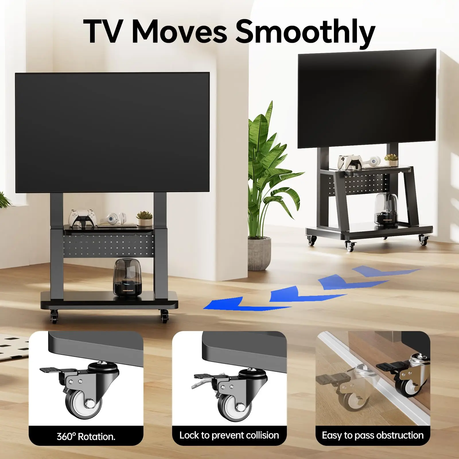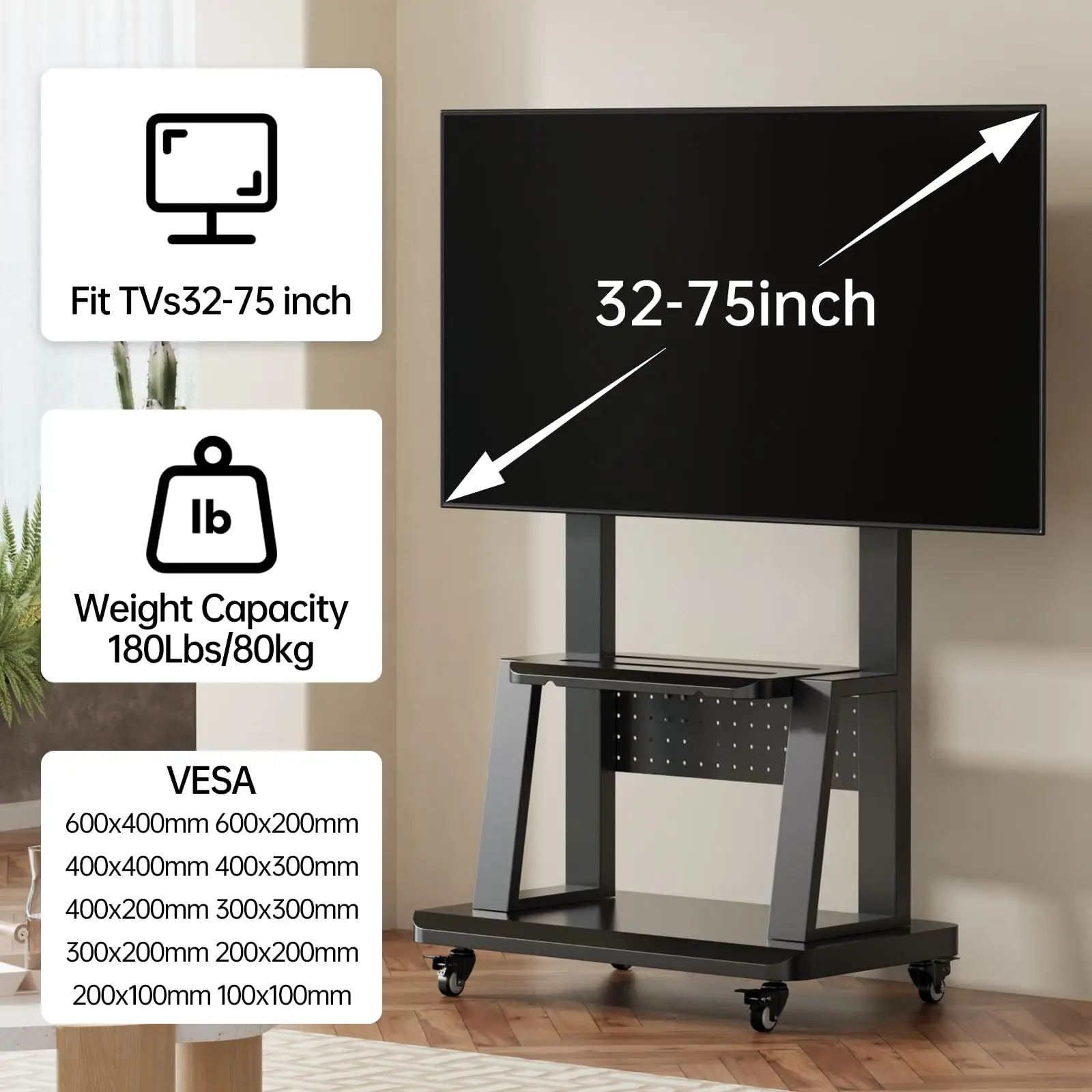 Soporte para TV móvil de altura ajustable, carrito para TV con ruedas para TV de 32 a 75 pulgadas, soporte para TV de piso portátil con estante de acero y plataforma con orificios