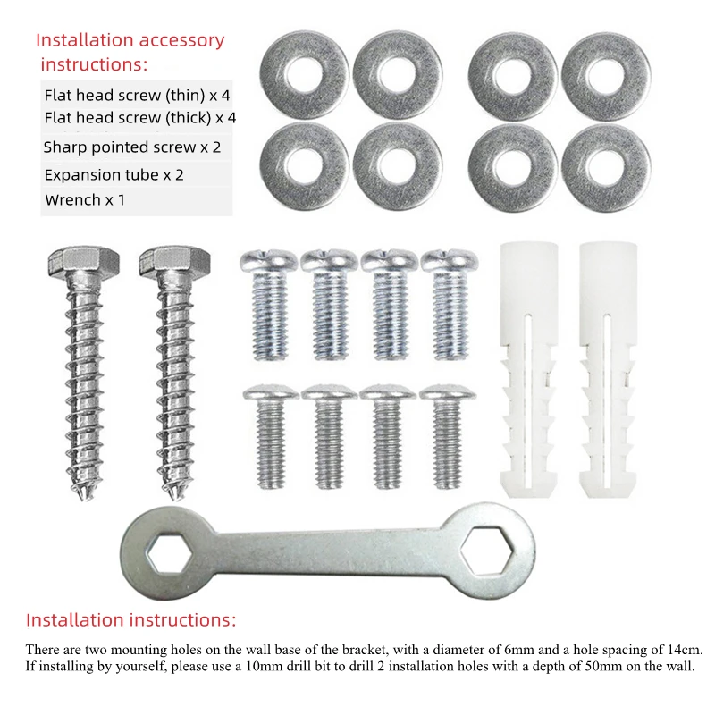Hay dos orificios de montaje en la base de pared del soporte, con un diámetro de 6 mm y un espacio entre orificios de 14 cm. Si lo instala usted mismo, utilice una broca de 10 mm para perforar 2 orificios de instalación con una profundidad de 50 mm en la pared.