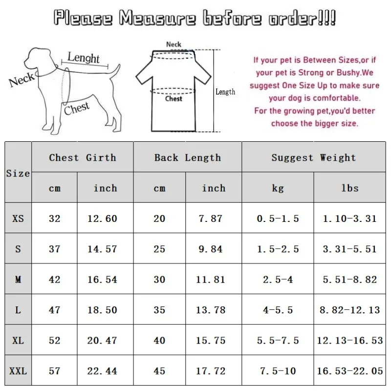 S: Pecho 37cm/14,57''; Longitud 25 cm/9,84''; Peso sugerido: 1,5-2,5 kg/3,31-5.51 libras.
