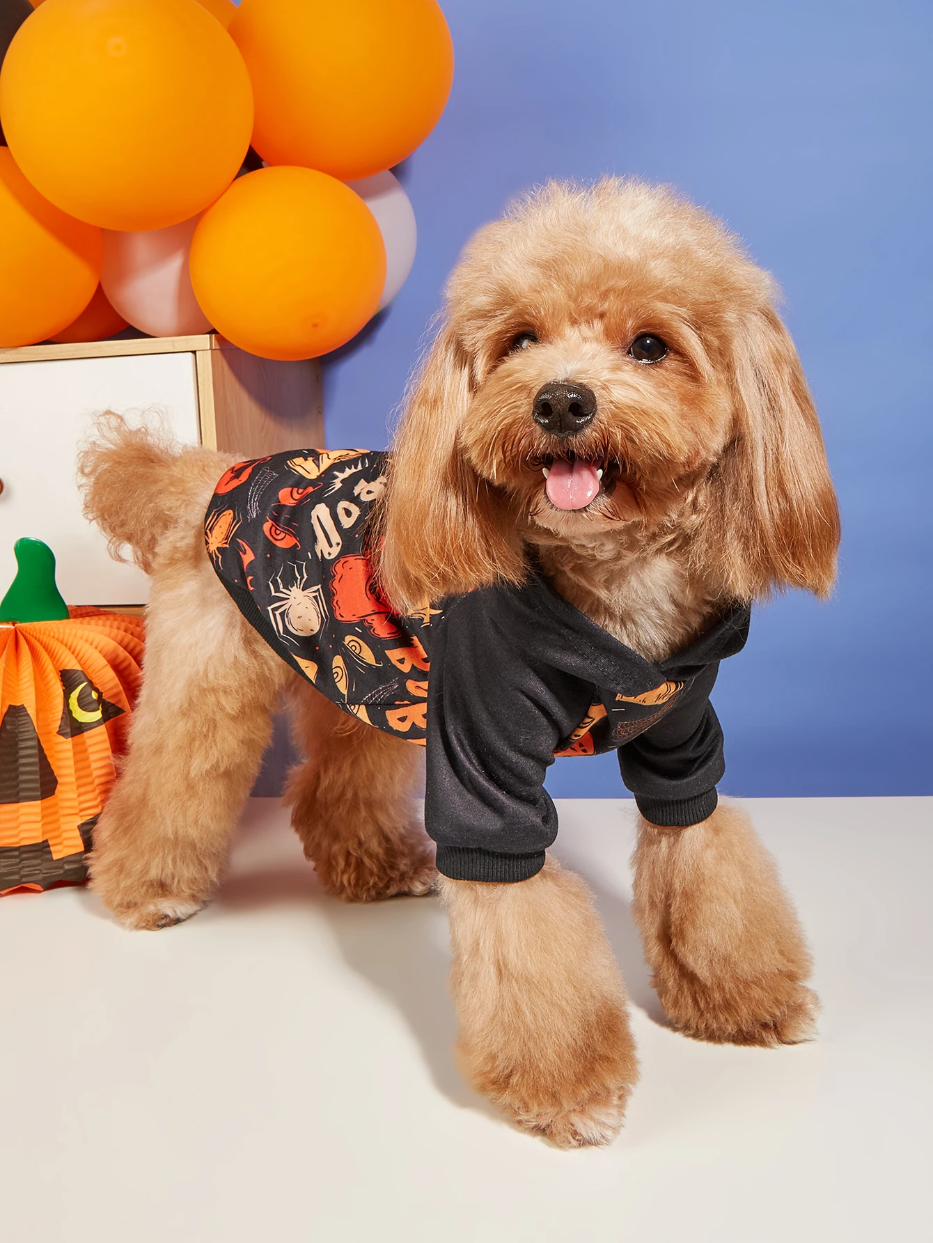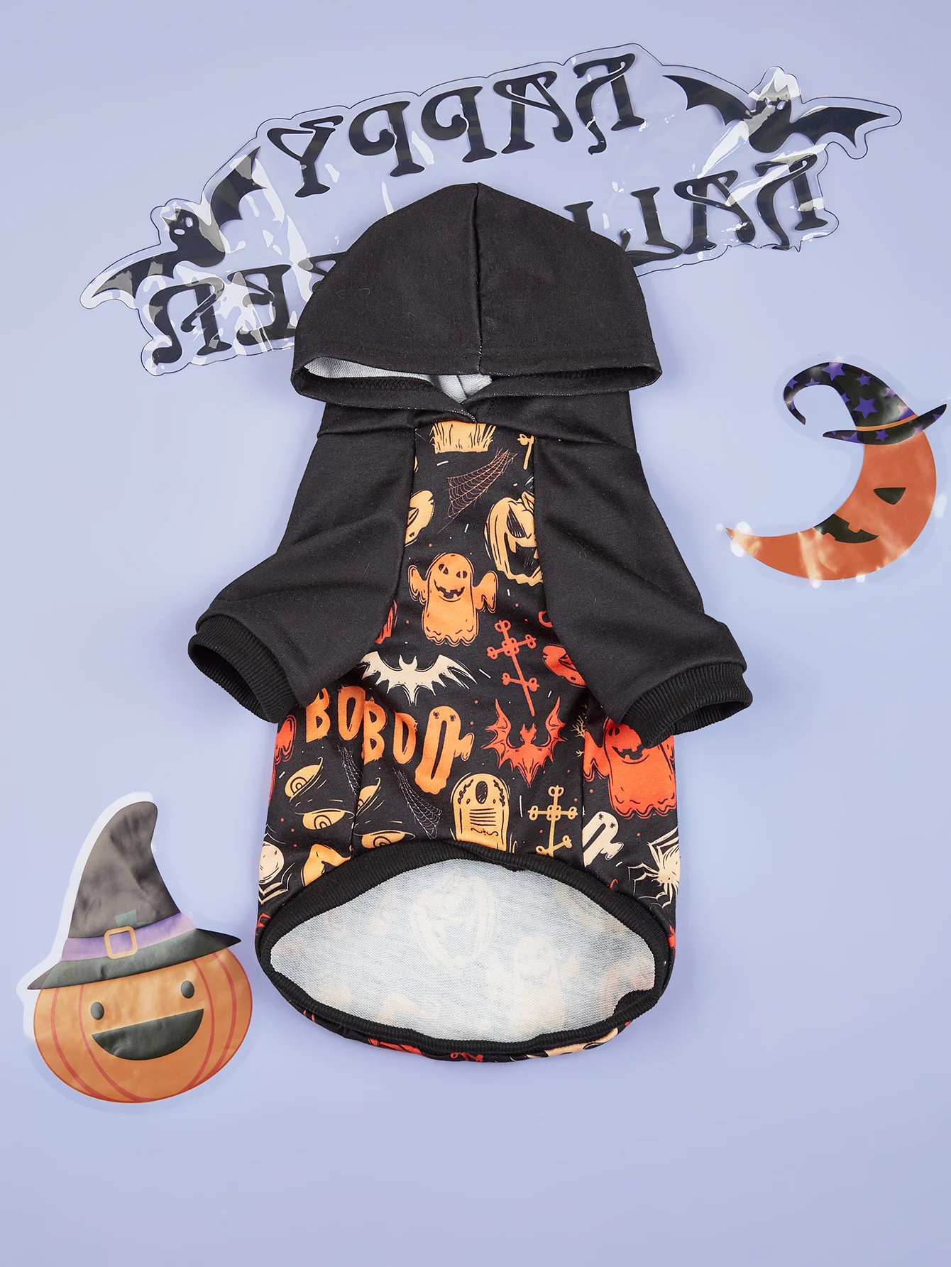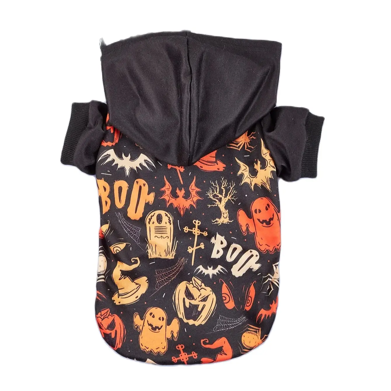 Sudadera con capucha para mascotas de Halloween con estampado de fantasmas, murciélagos y lápidas, sudadera negra para mascotas con capucha para perros pequeños/gatos, traje festivo