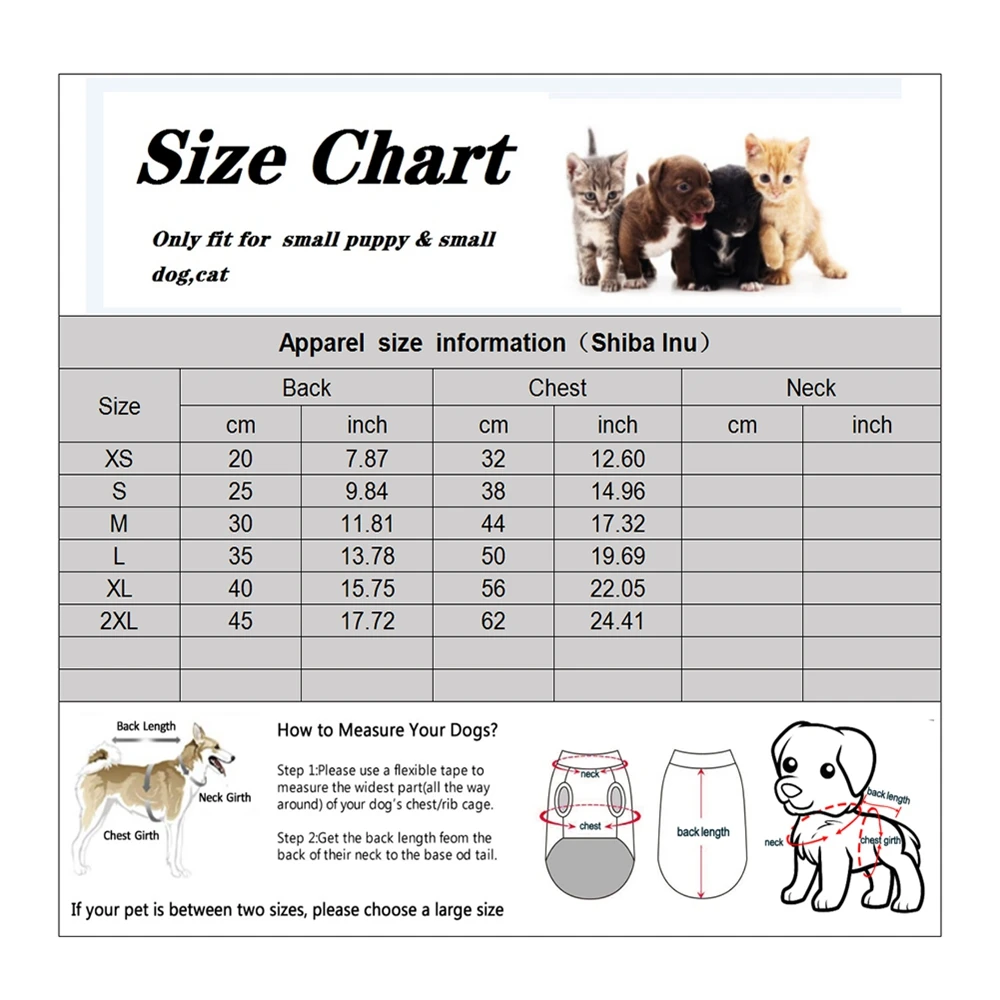 4, análisis de tallas: es posible que su mascota use ropa de talla pequeña a menudo, pero esto no significa que toda la ropa de talla pequeña sea adecuada para ella, diferentes diseños, telas y otros factores pueden diferentes tallas de ropa. Entonces, cuando elijas un chaleco para tu linda mascota, consulta nuestra lista de tallas y duplica la talla.
