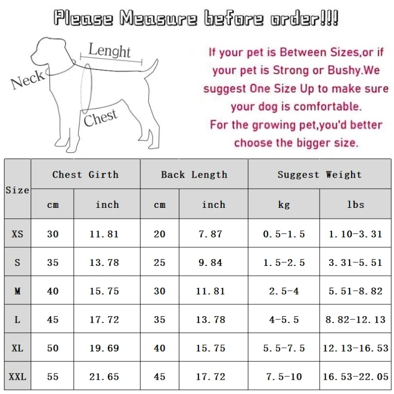 XL: Pecho 50 cm/19,69''; Longitud 40 cm/15,75 ''; Peso sugerido 55,5 kg/12,13-16.53 lbs.