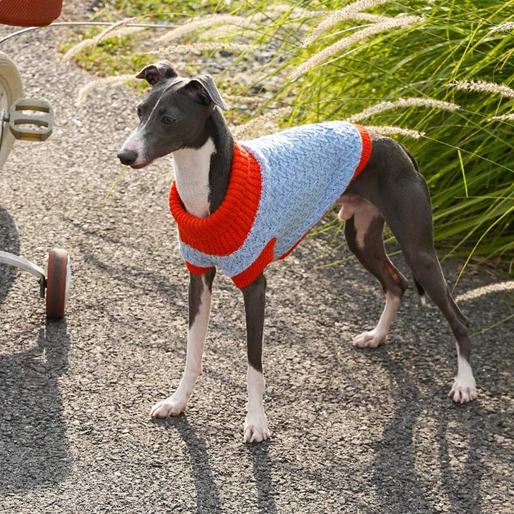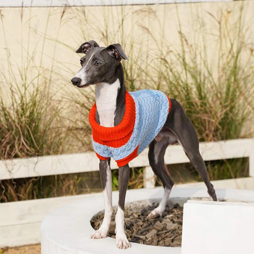 Suéter azul para cuerpos italianos, abrigo suave tejido a mano de 2 patas para perros Whippet de medios pequeños, ropa de descanso cálida para perros pequeños
