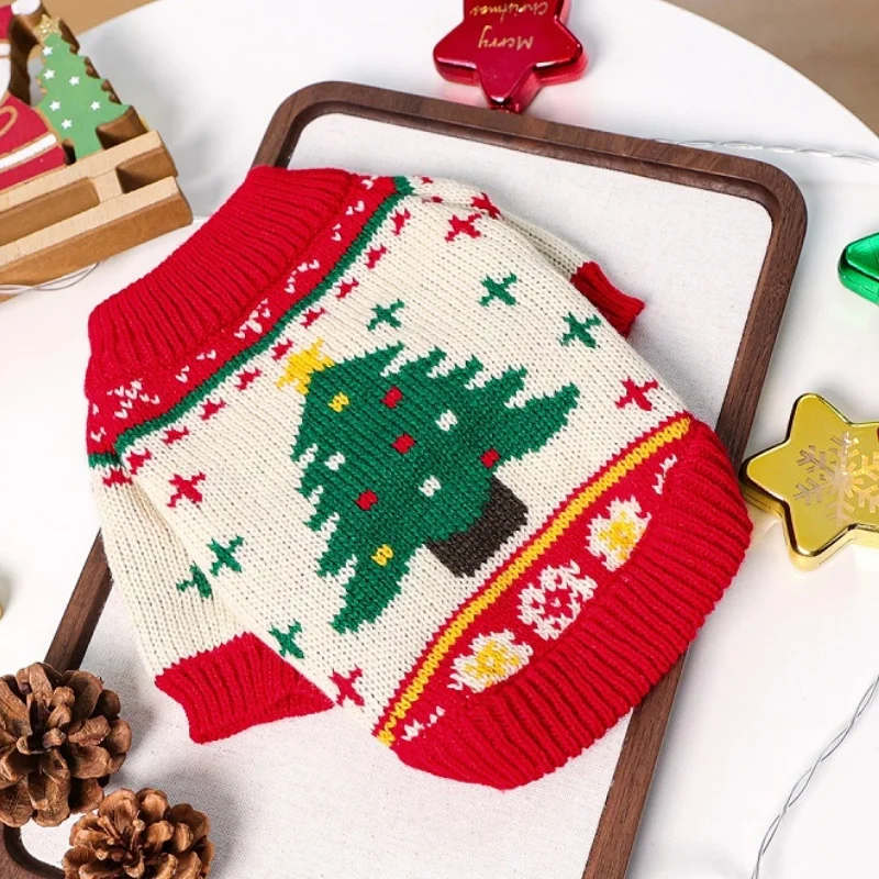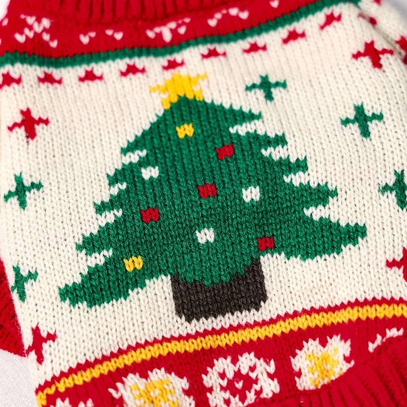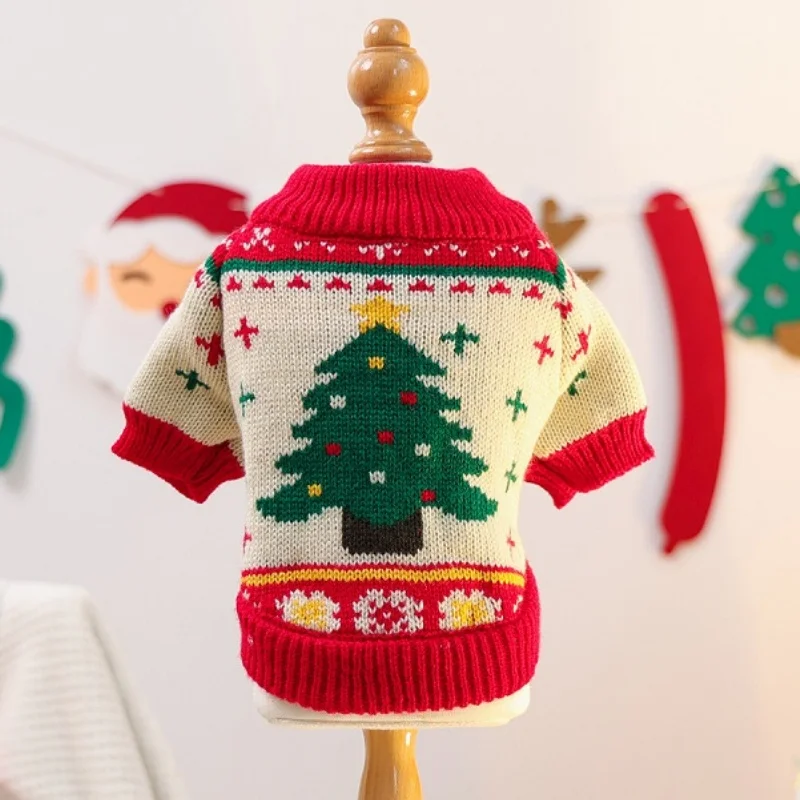 Suéter bonito de lujo para perros, ropa cálida y suave para perros, jerseys de punto para cachorros de invierno, suéter con cuello alto y gato con estampado de árbol de Navidad para mascotas
