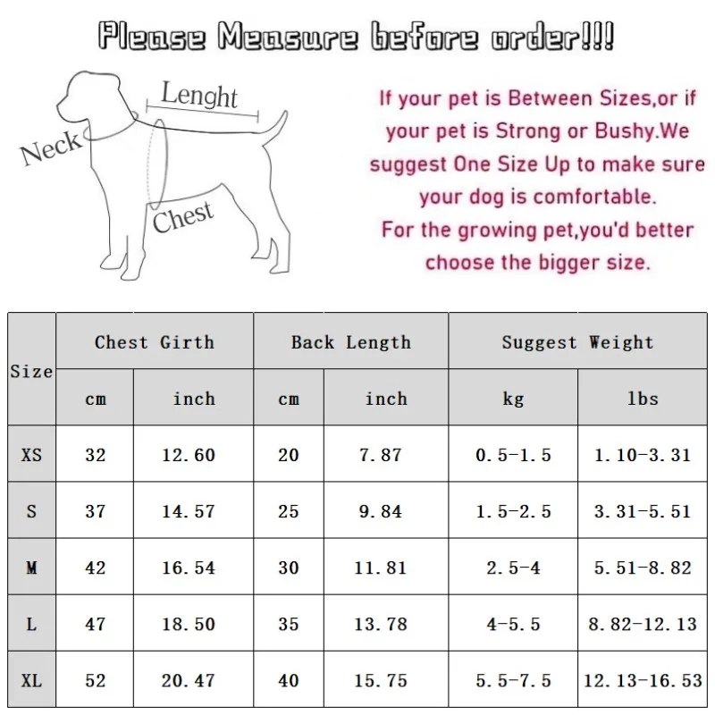 S: Pecho 37cm/14,57''; Longitud 25 cm/9,84''; Peso sugerido: 1,5-2,5 kg/3,31-5.51 libras.