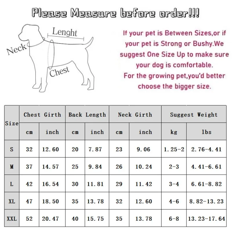 XXL: Pecho 52cm/20,47''; Longitud 40cm/15,75''; Cuello 35cm/13,78''; Peso sugerido 6-8 kg/13,23-17,64 libras.