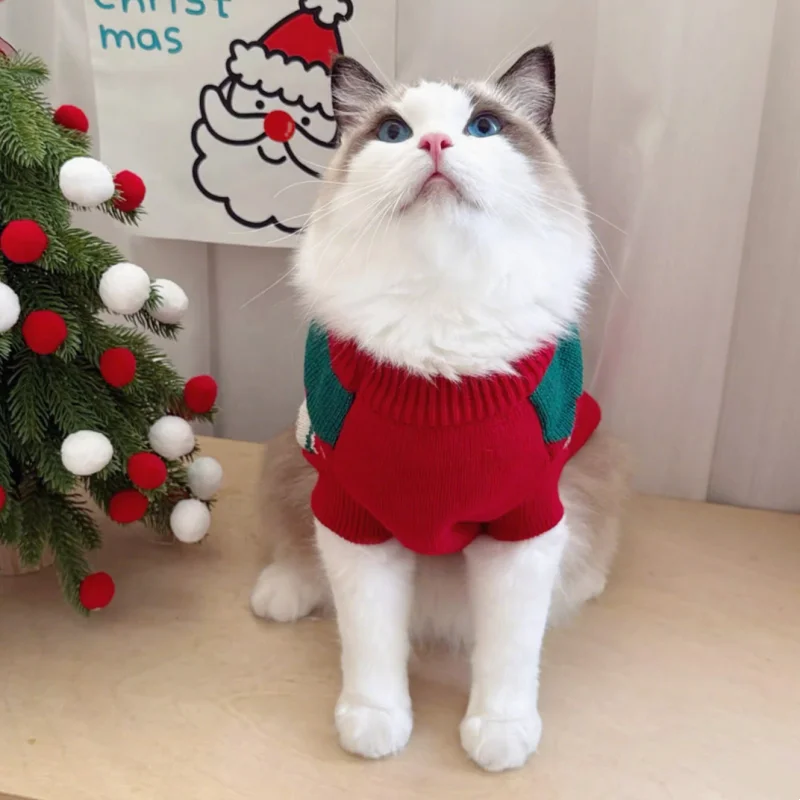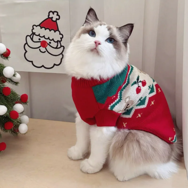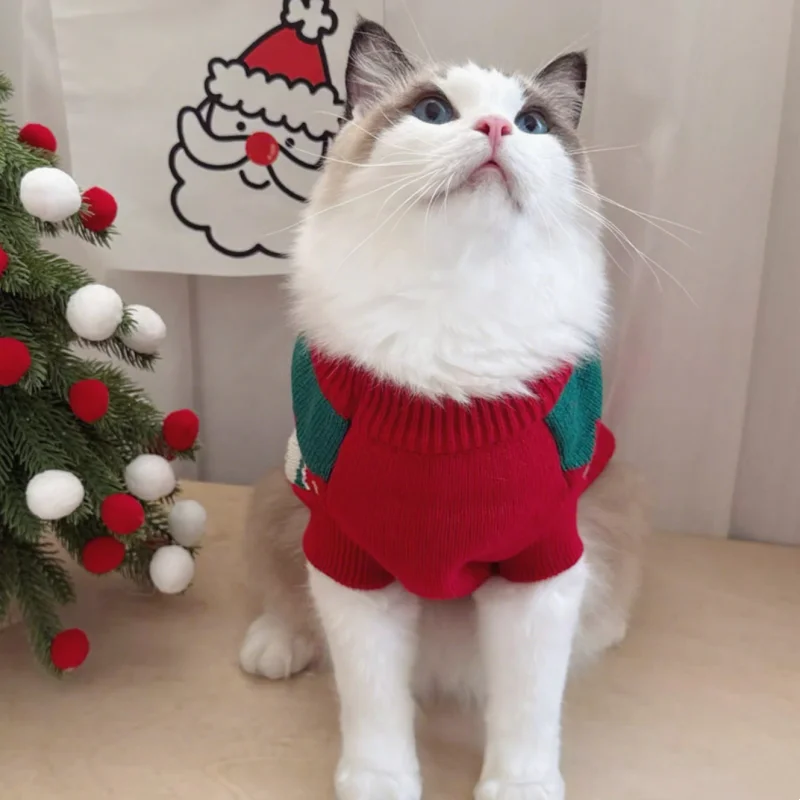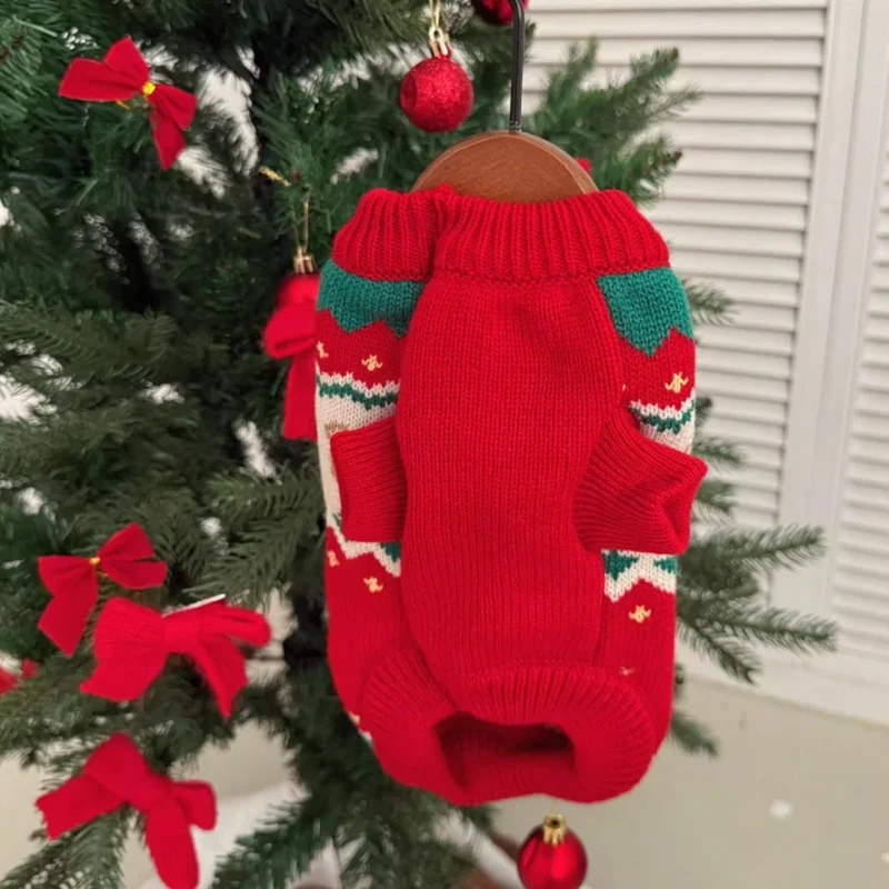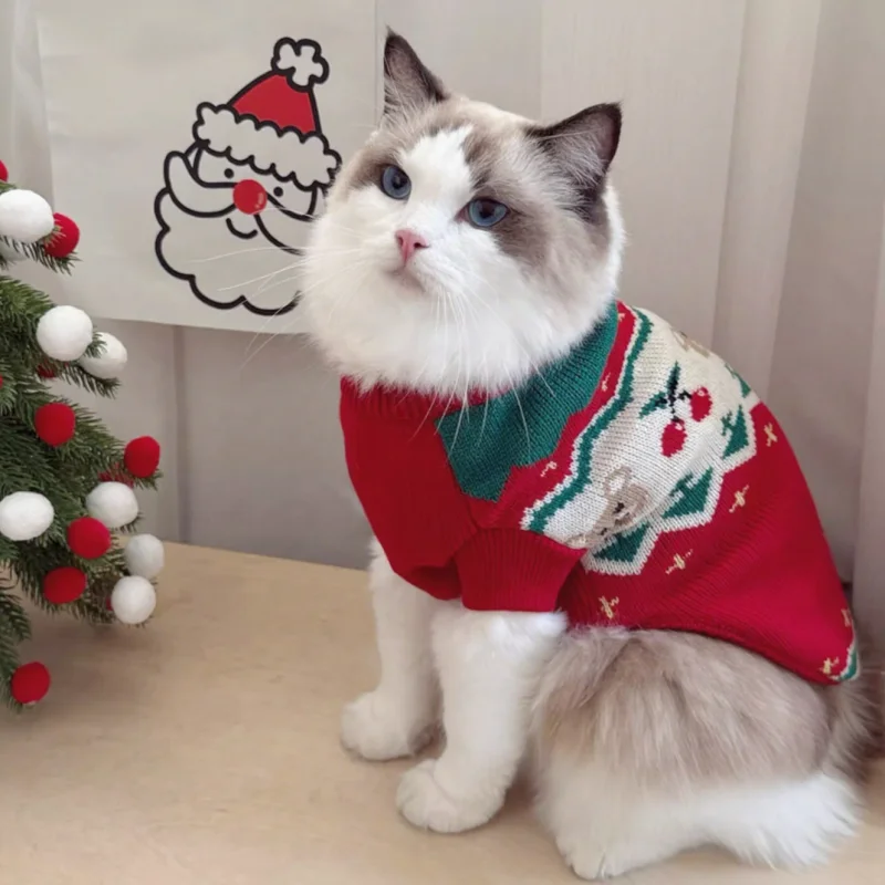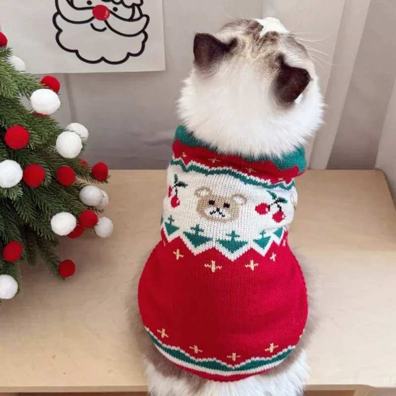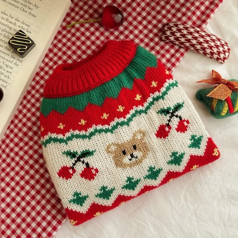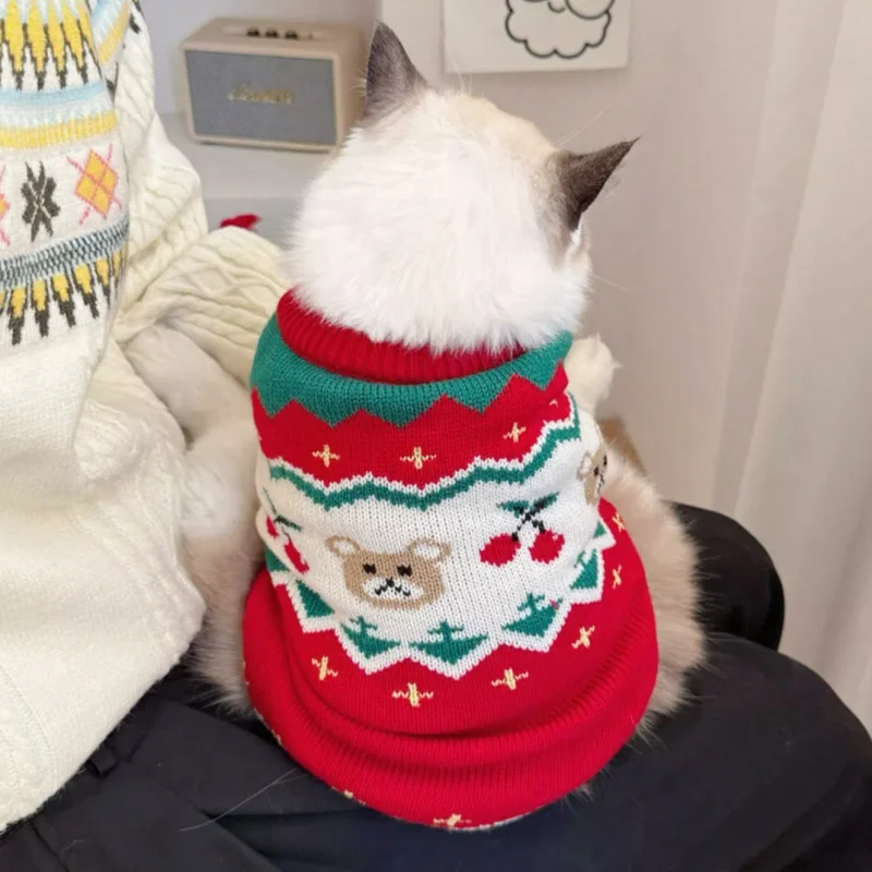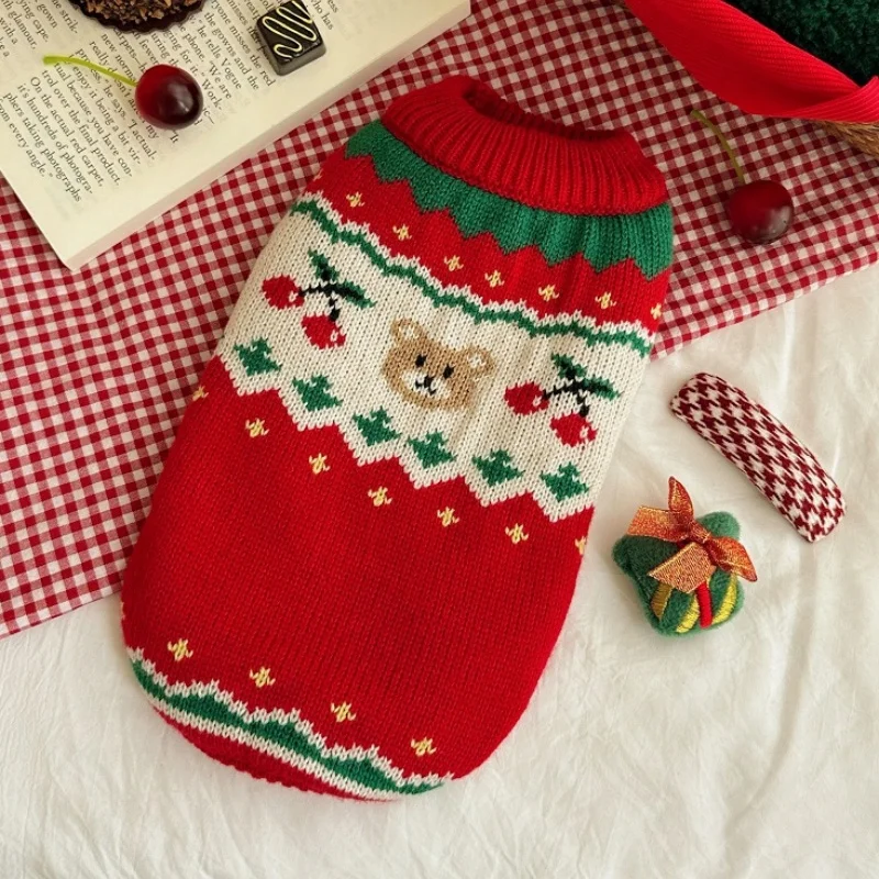 Suéter cálido de invierno para perros, ropa de moda para perros con estampado de cerezas, cuello alto para cachorros, suéter de gato navideño, jersey de punto para mascotas, disfraz de caniche