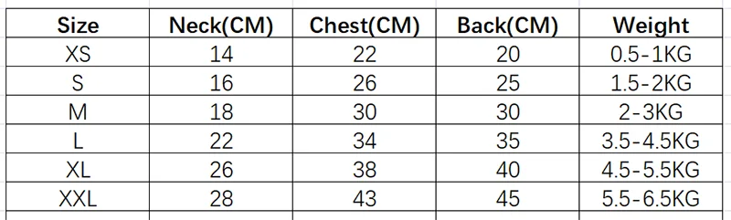 Tamaño Cuello (CM) Pecho (CM) Espalda (CM) Peso