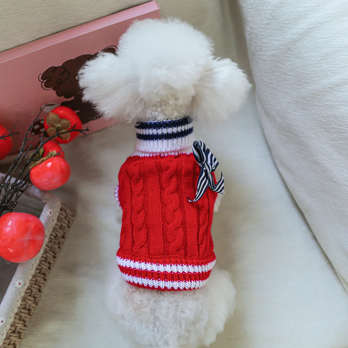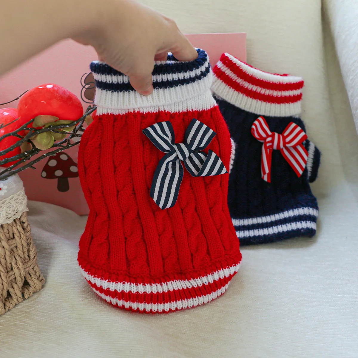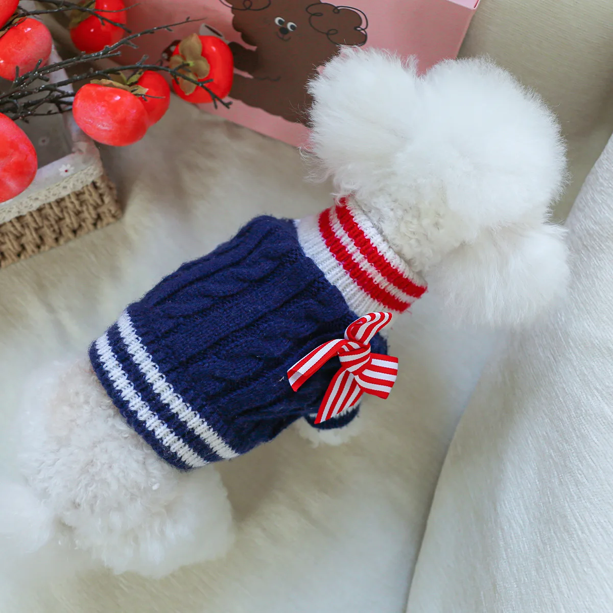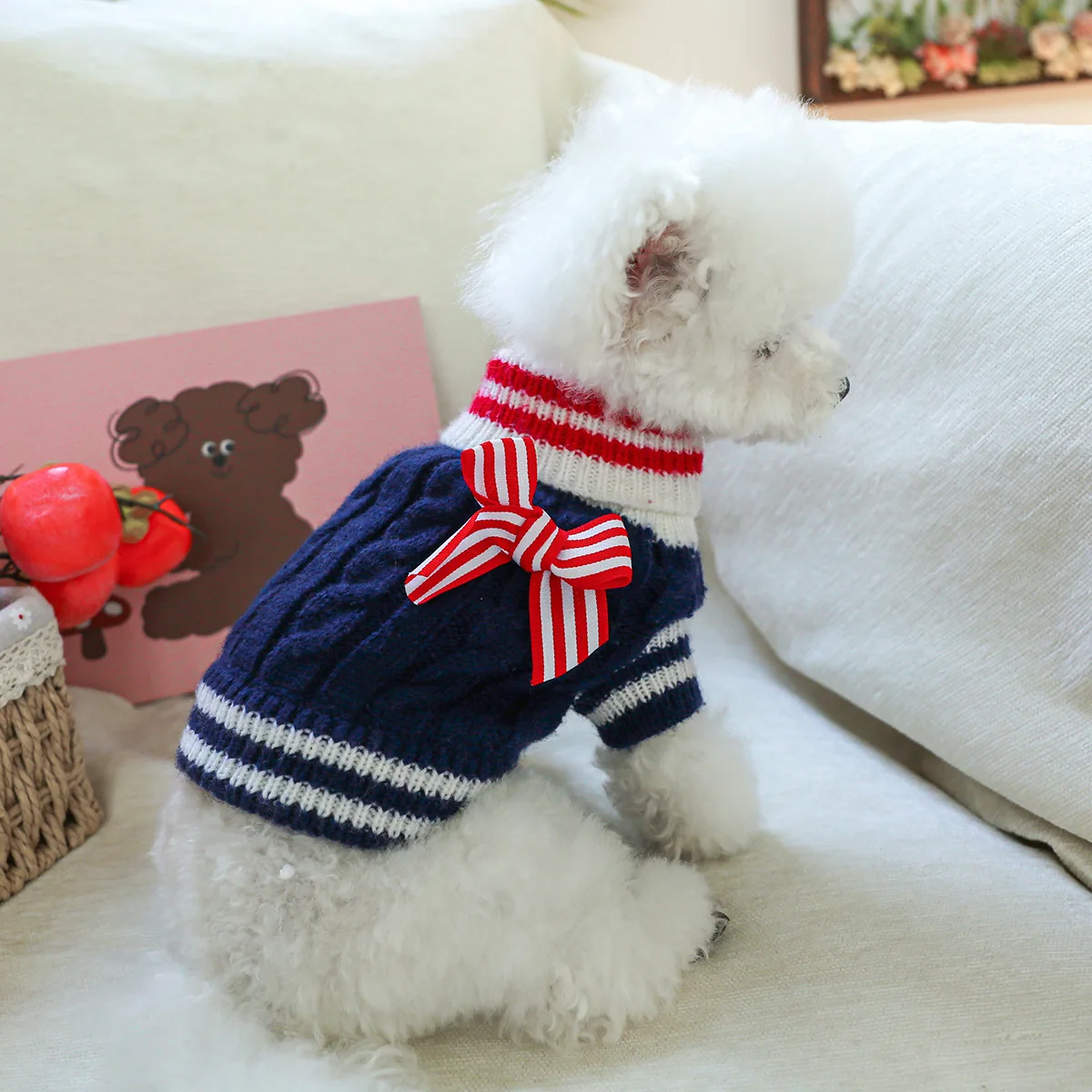 Suéter de cuello alto para mascotas, suéter de punto a rayas para otoño e invierno, abrigo azul marino con lazo para perro y gato, ropa de Navidad para perros, ropa para cachorros