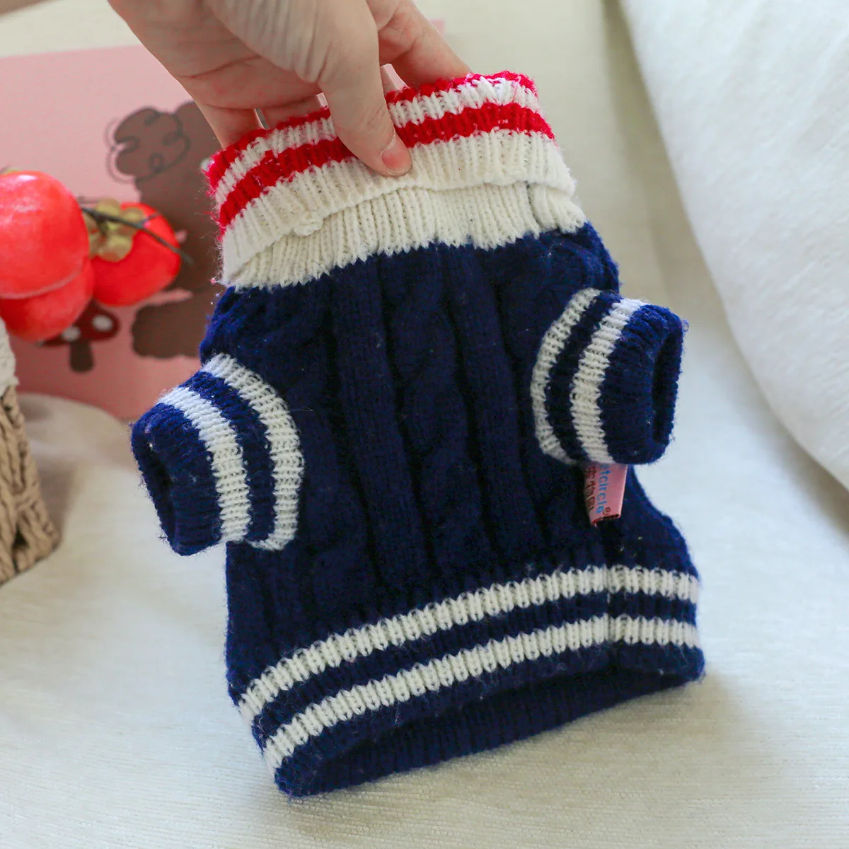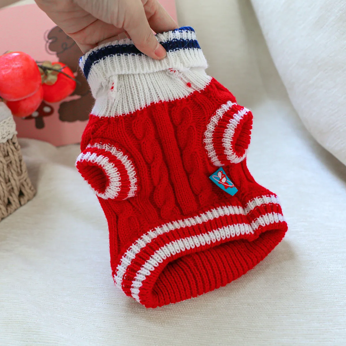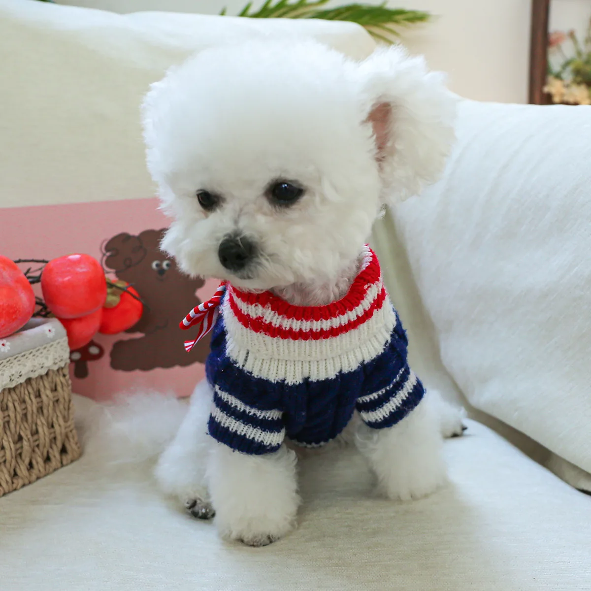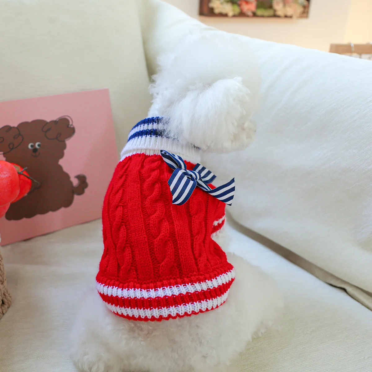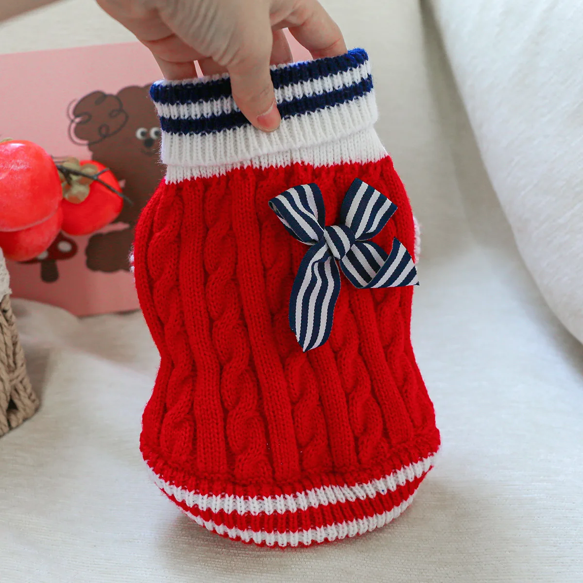 Suéter de cuello alto para mascotas, suéter de punto a rayas para otoño e invierno, abrigo azul marino con lazo para perro y gato, ropa de Navidad para perros, ropa para cachorros