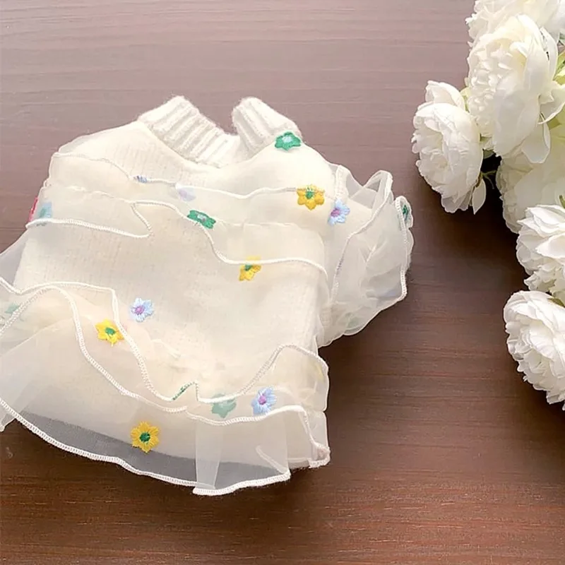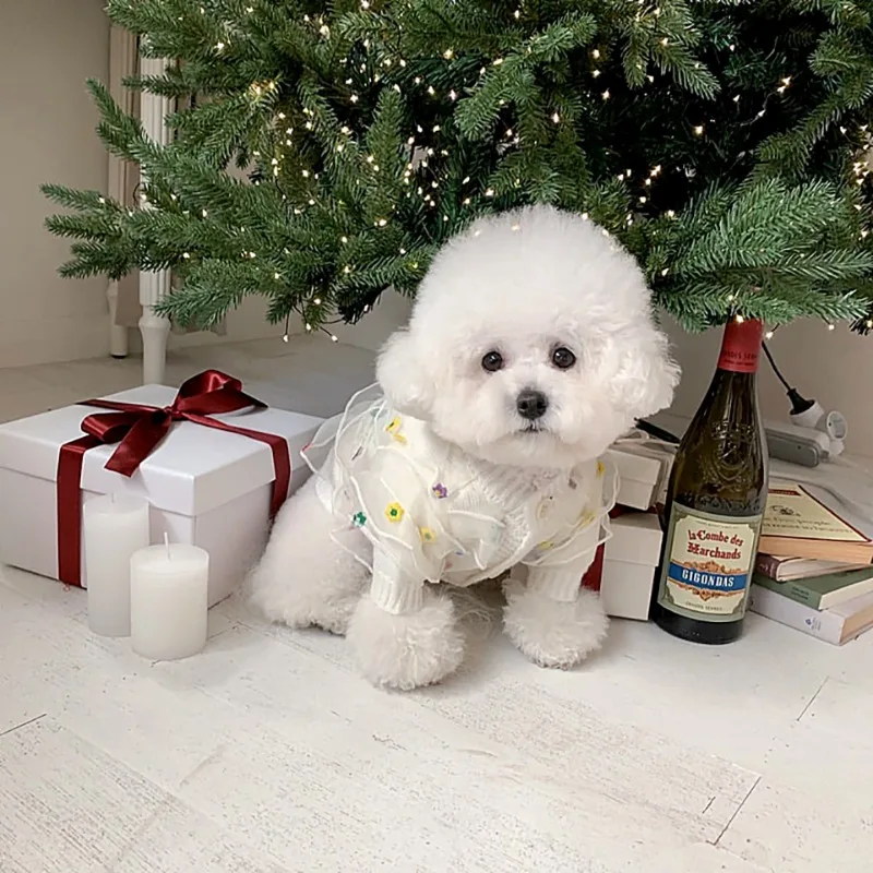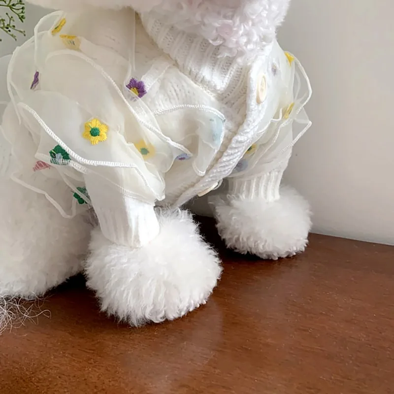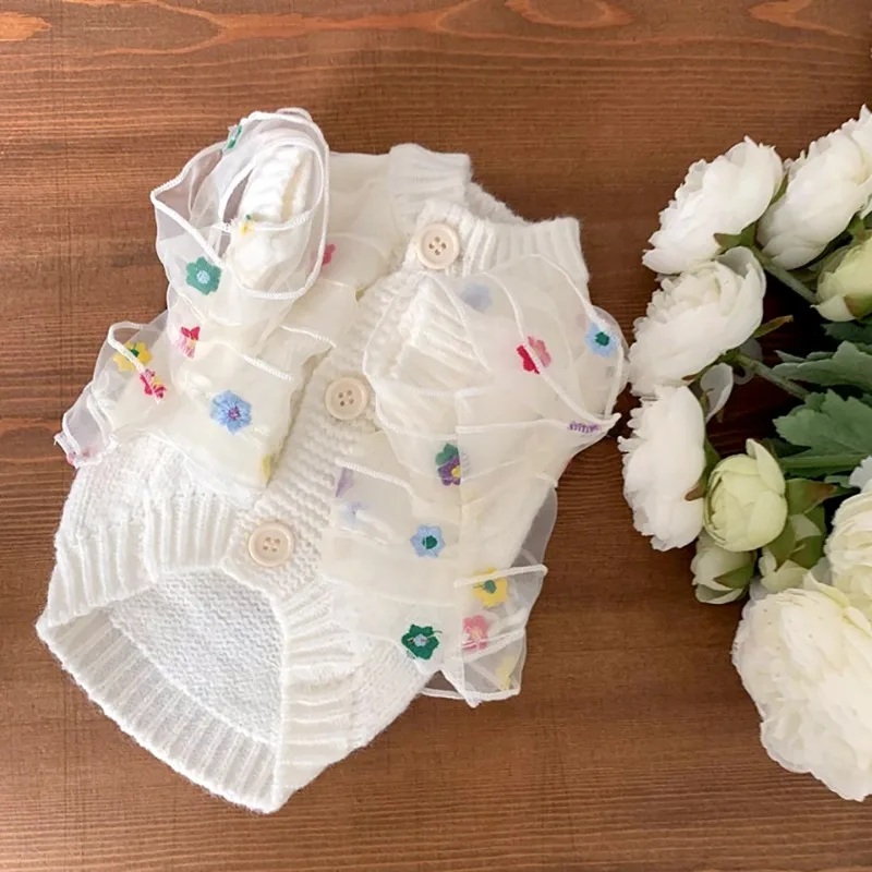 Suéter de encaje con bordado de flores para perro, abrigo cálido de invierno, ropa blanca clásica para mascotas, camisa bonita con botones abiertos para perro