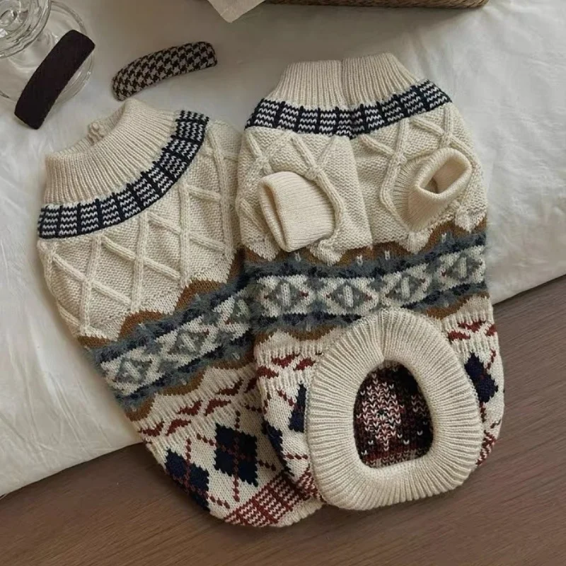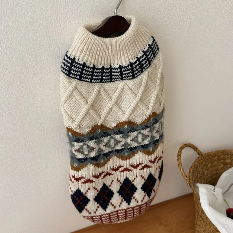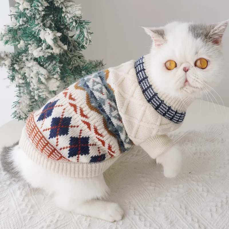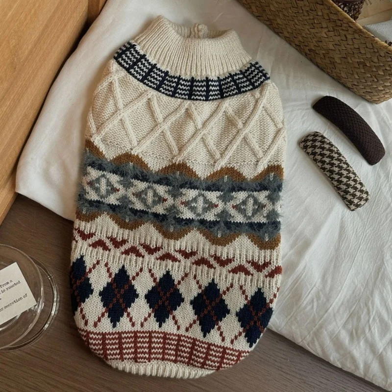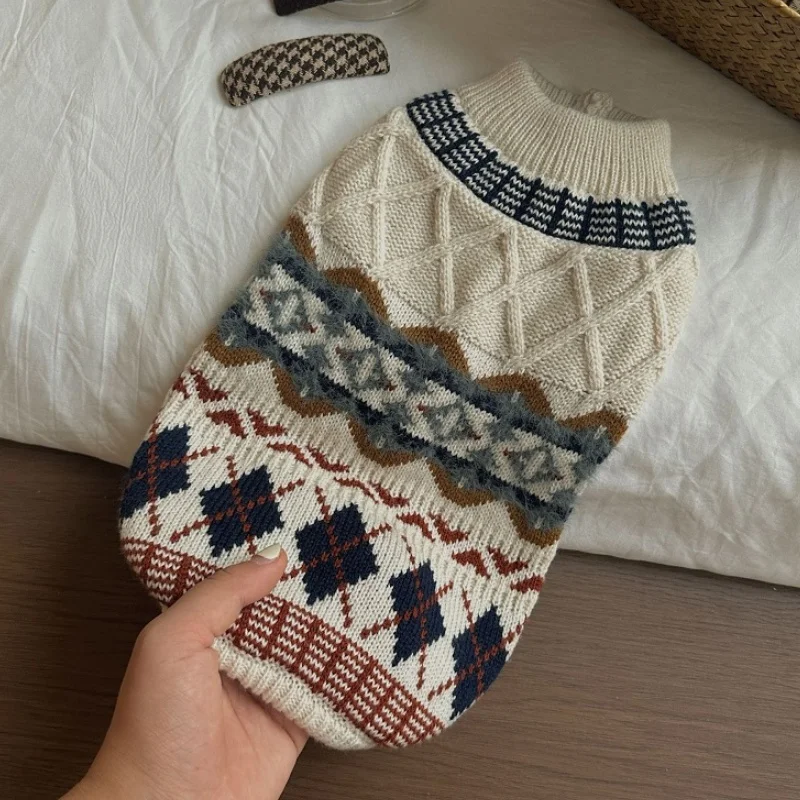 Suéter con estampado de rombos para perro, ropa Retro bonita para perro, jerseys de punto cálidos para cachorros de invierno, cuello alto de gato de lujo, trajes para mascotas Chihuahua