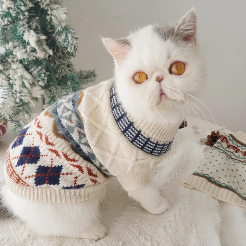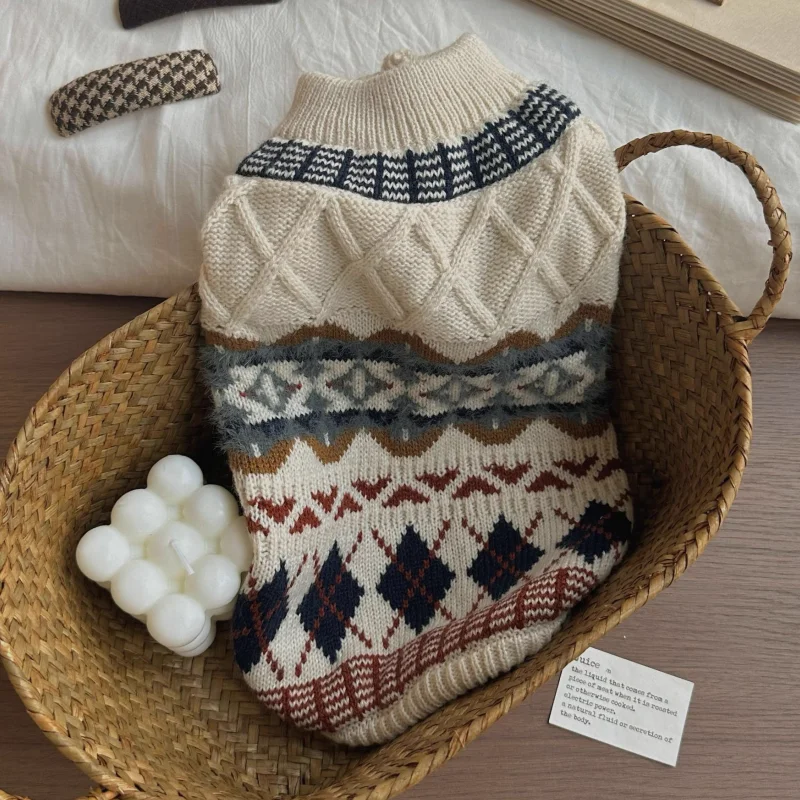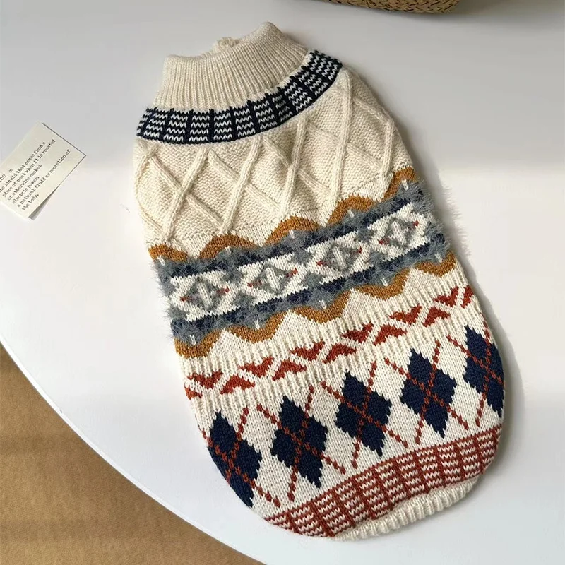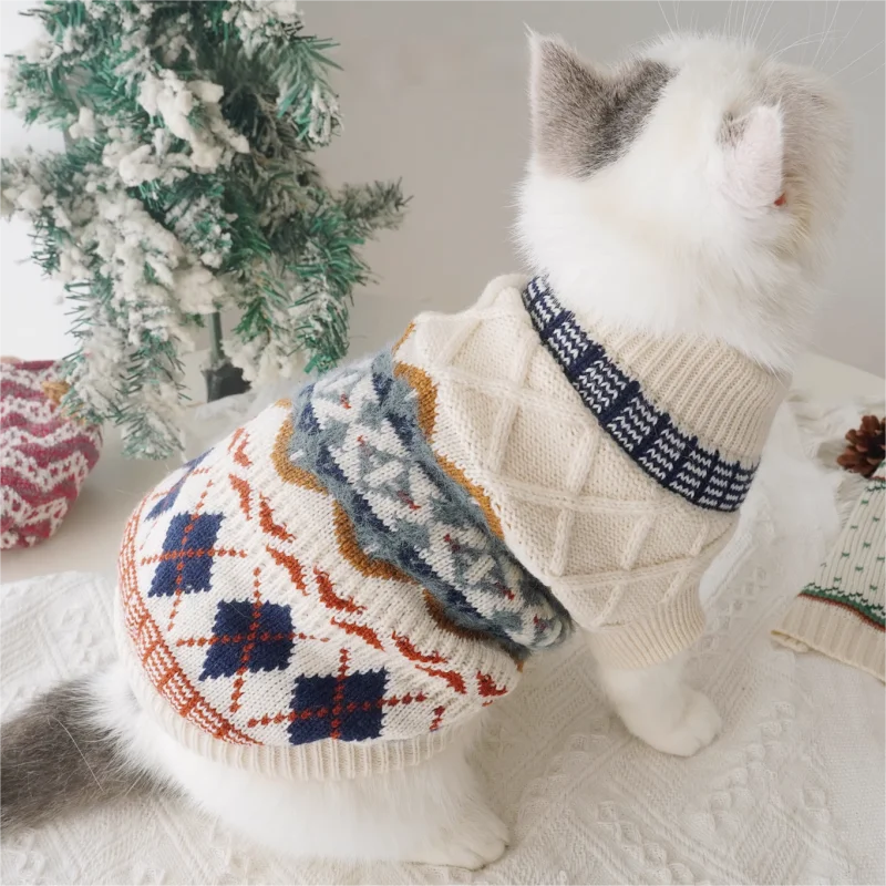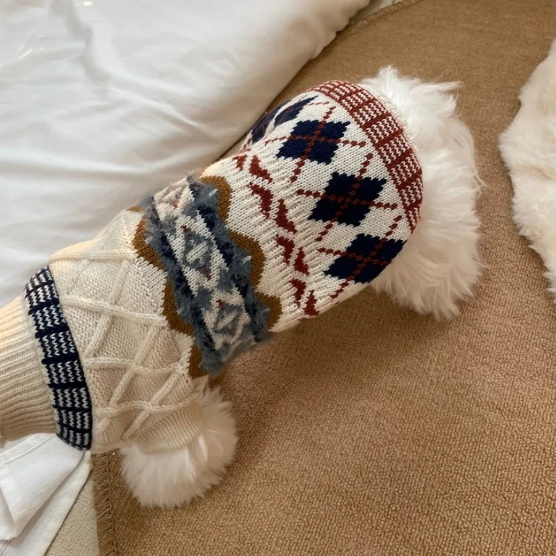 Suéter con estampado de rombos para perro, ropa Retro bonita para perro, jerseys de punto cálidos para cachorros de invierno, cuello alto de gato de lujo, trajes para mascotas Chihuahua