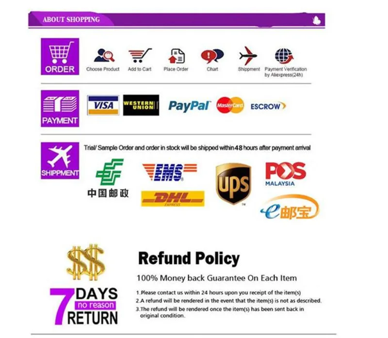 3.Si desea recibir el artículo más rápido, puede elegir otro envío, como EMS, Fedex, pero