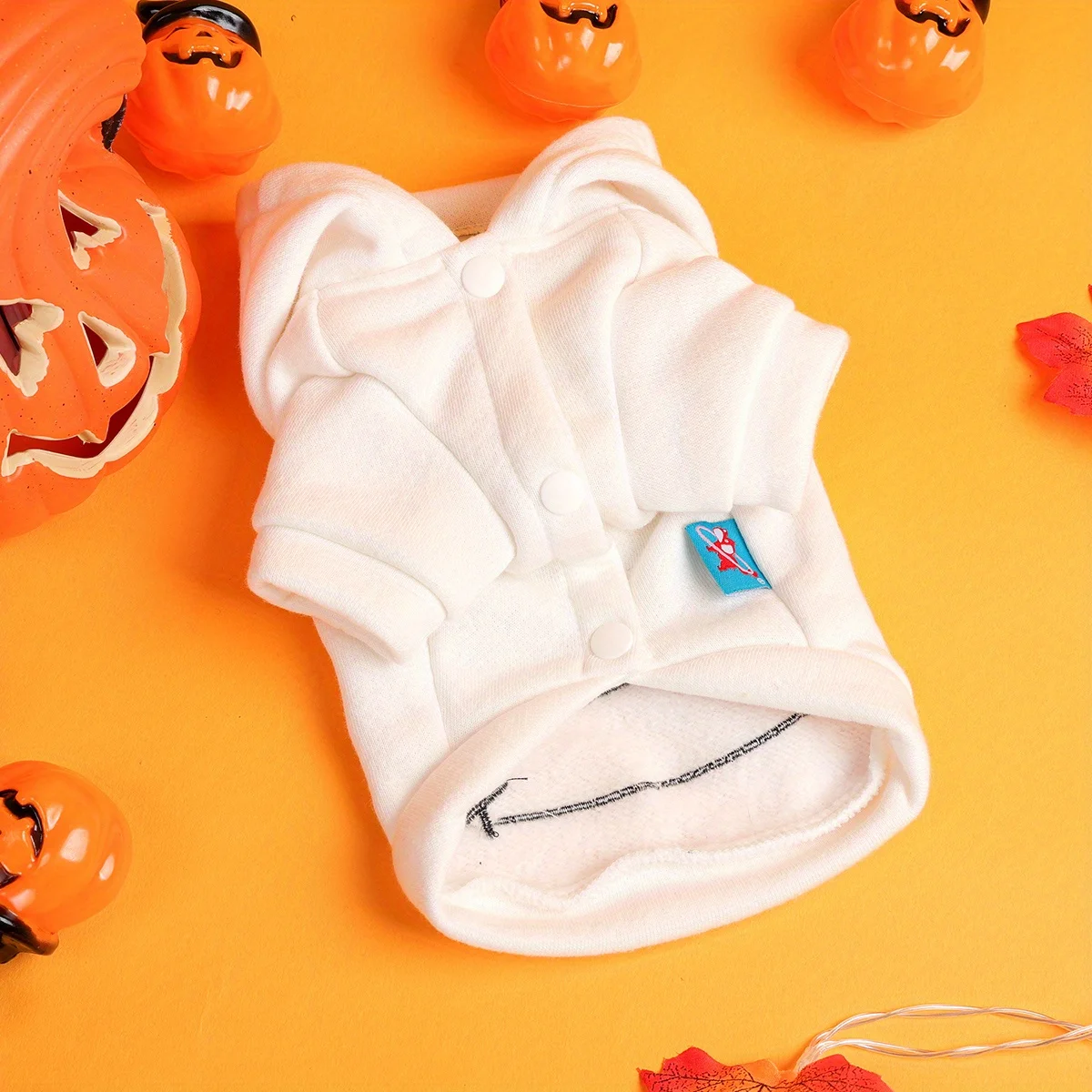 Suéter de Halloween para mascotas, chaqueta con capucha blanca cálida con botones abiertos y bordado divertido, ropa suave para mascotas para perros y gatos para perros pequeños