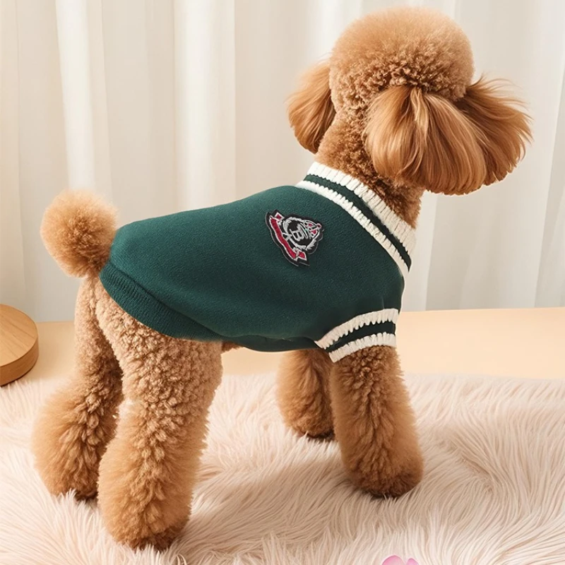 Chaleco para perros estilo universitario con cuello en V: suéter tejido de otoño e invierno para perros y gatos pequeños