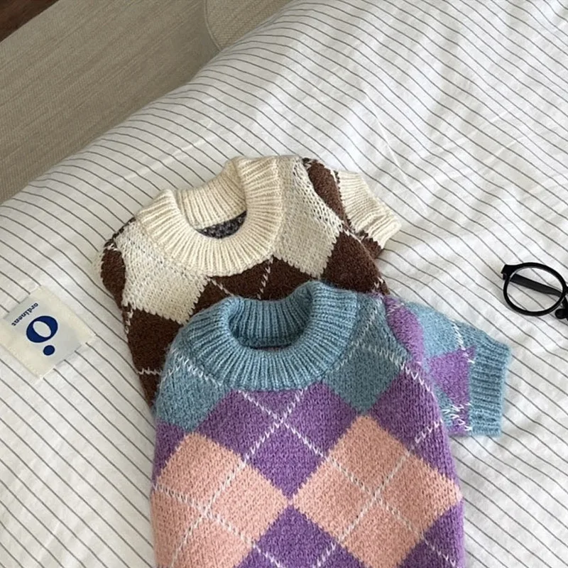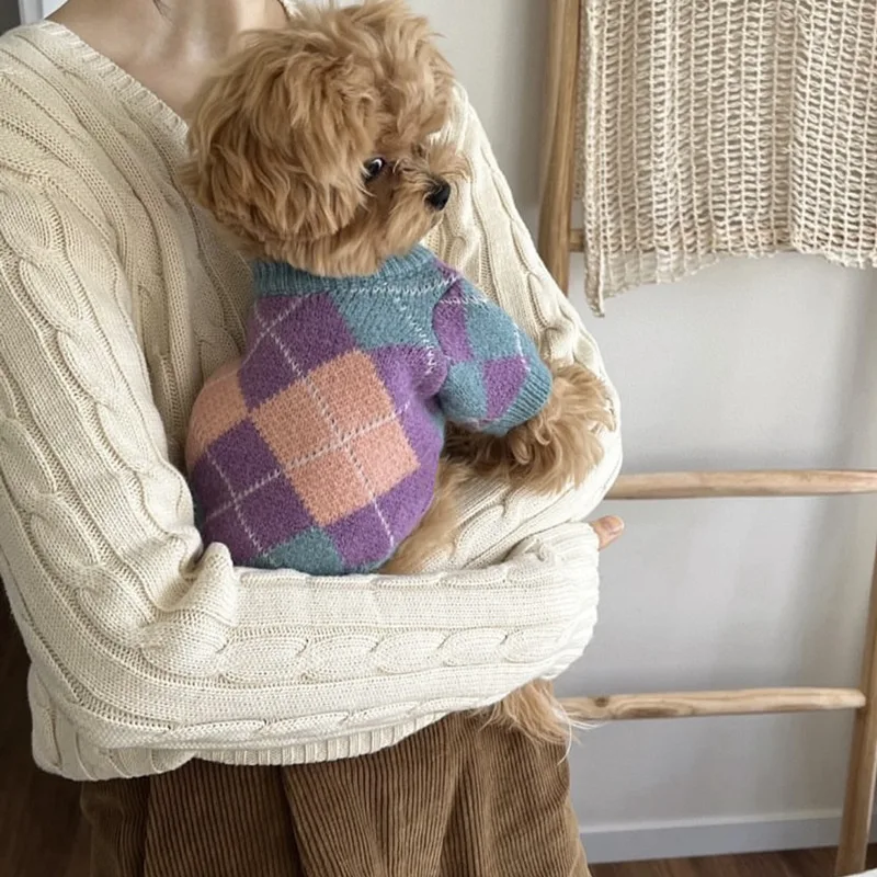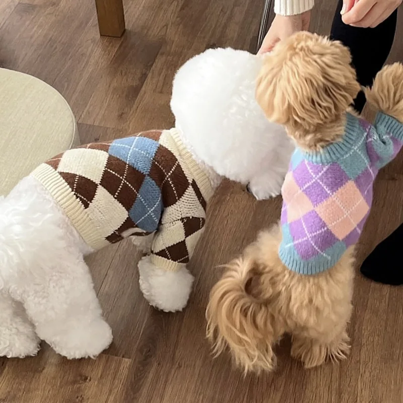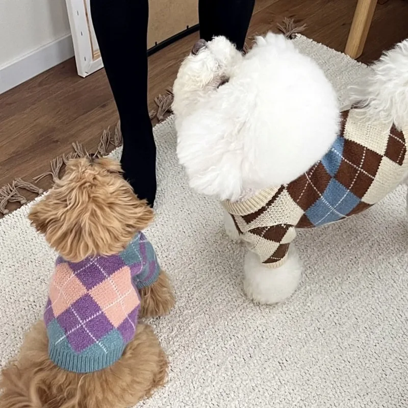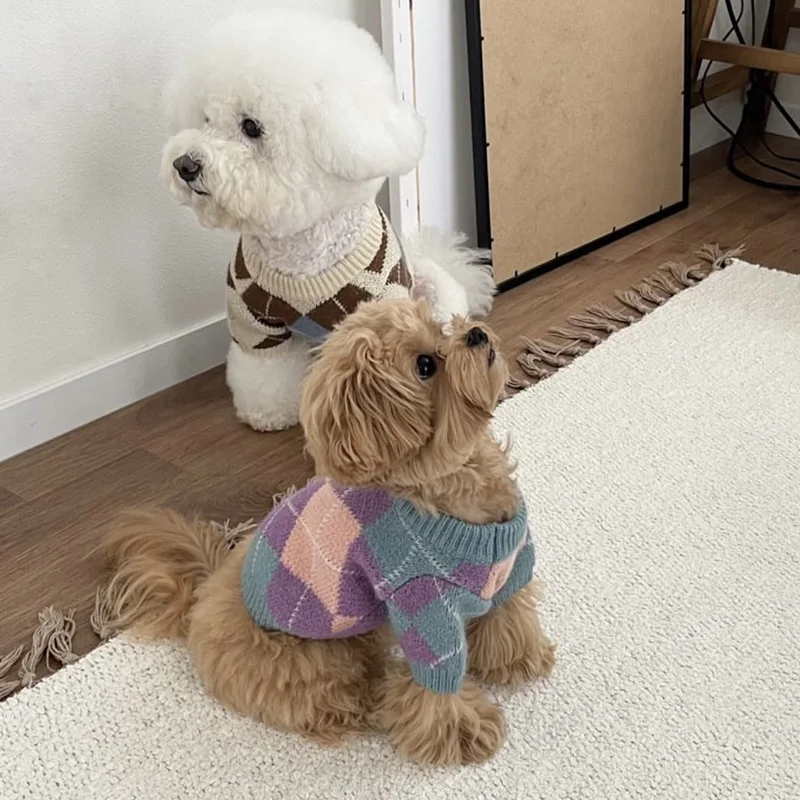 Suéter de moda para mascotas, suéter maltés a cuadros Beige, Top de punto cálido para mascotas, ropa de invierno de dos patas, jersey grueso para perros